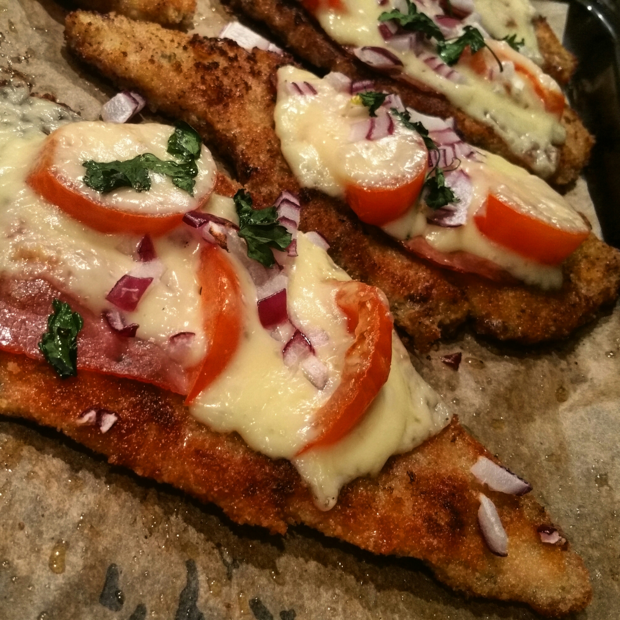 Detta är en favorit. Utbankad och dubbelpanerad (50/50 med pankopanering och ströbröd) skinksnitzel. Lite dragon, vitlök och körvel i paneringen. Garnerad och gratinerad med rökt skinka, skivad tomat, prästost, rödlök och bladpersilja. Sedan lite räkor uppepå samt vitlökssmör till servering med pommes, sallad, bearnaisesås och stekta champinjoner.