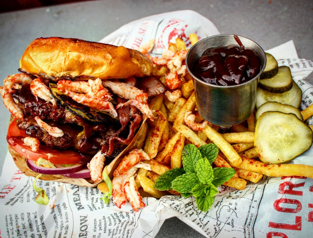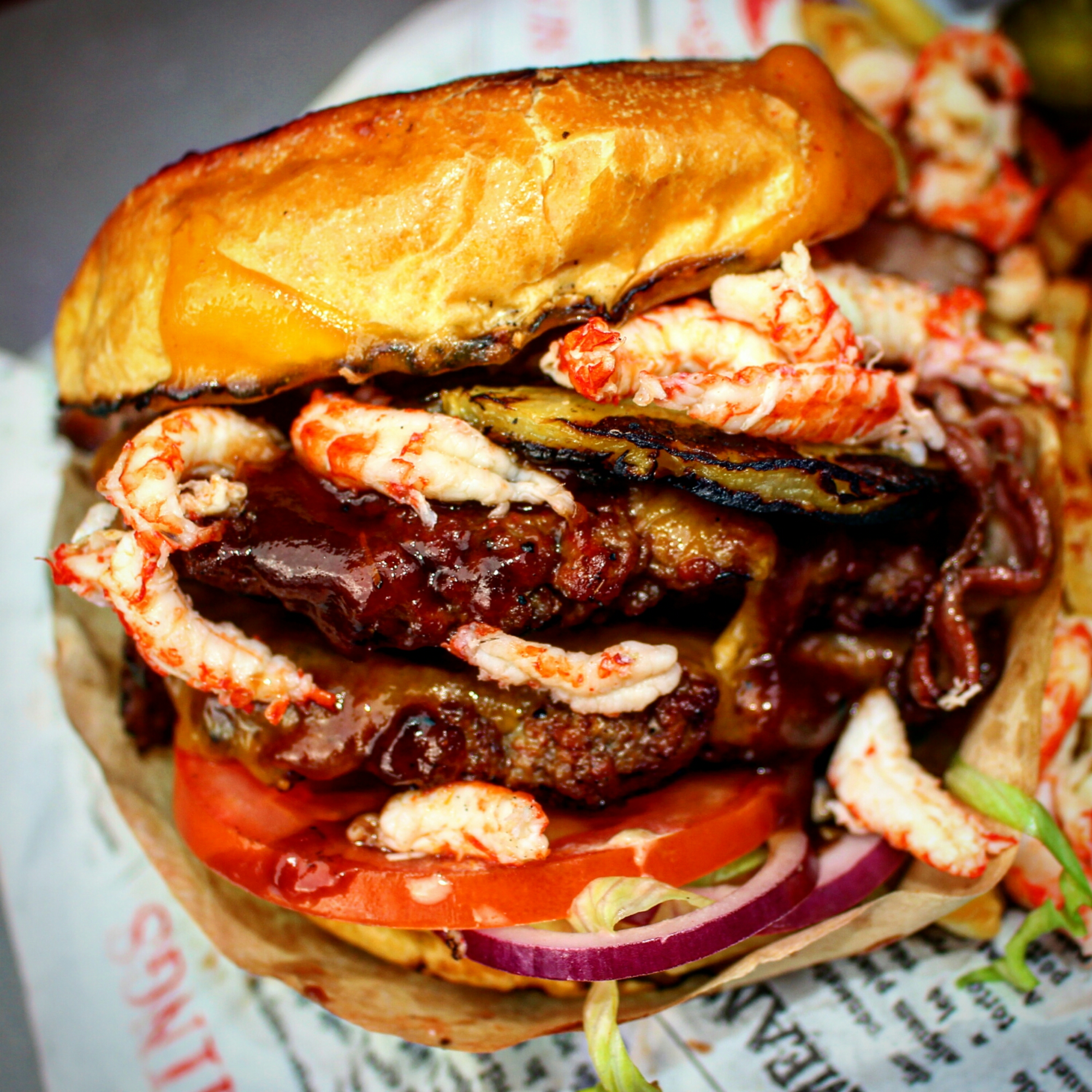National cheeseburger day anyone? Det fick ju bli en lite cheeseburgare såklart. Briochebröd med en hemmagjord Big Mac sås i botten. Strimlad isbergssallad, rödlök och tomat. Dubbla nötfärsburgare med varsin skiva cheddarost på. Sweet baby rays bbqsås. En skiva ananas, bacon och kräftstjärtar. En skiva cheddarost till i locket. Lite friterade pommes och saltgurka vid sidan om.