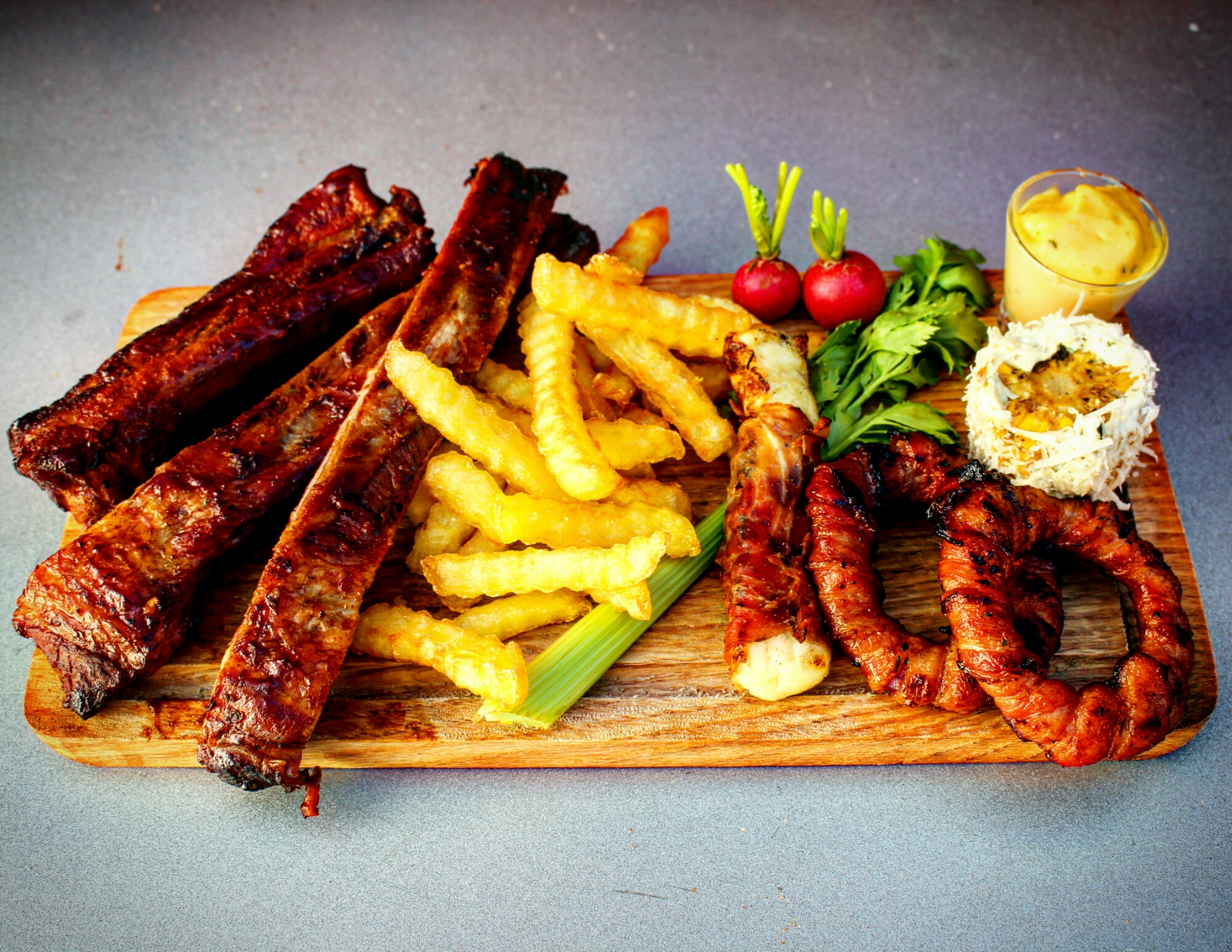 Goda vänner på besök idag. Och eftersom jag fick tacka nej till att lira fotboll kunde jag lika gärna starta röken. Revben. Både spareribs och tjocka ribs. Tillagade enligt 3-2-1 metoden. Först rubbade och rökta under ca 3h med äpple och whiskeyflis. Sedan i folie i två timmar med äppeljuice och öl. Sedan en timme till med Sweet baby Ray’s bbqsås. Serverat med friterade pommes, baconlindad rödlök, grillad majs rullad i färskost och parmesan, rädisa, stjälkselleri och aioli. Grillad halloumi med lufttorkad skinka. Gjorde även ett litet vitlöksbröd med vitlökssmör, mozzarella och jalapeno. Inte så dumt.