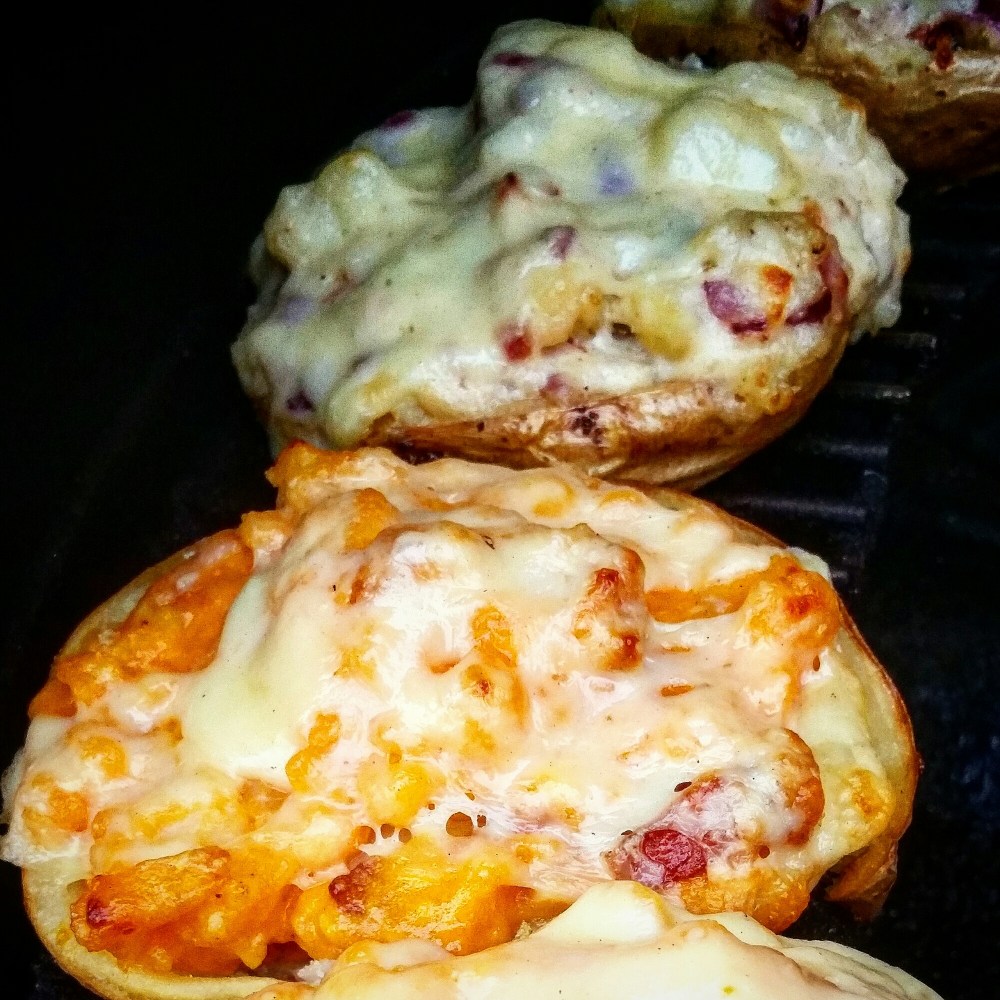 Jacksonpotatis. Bakpotatis som körs färdig indirekt på grillen. Gröp ur och blanda potatisen med något gött. I dagens fall två versioner. En med potatis, bacon, rödlök, färskost med smak av jalapeno och riven ost. Toppad med skivad prästost. Och så en barnvänlig version med potatis, majonnäs, ketchup och bacon.