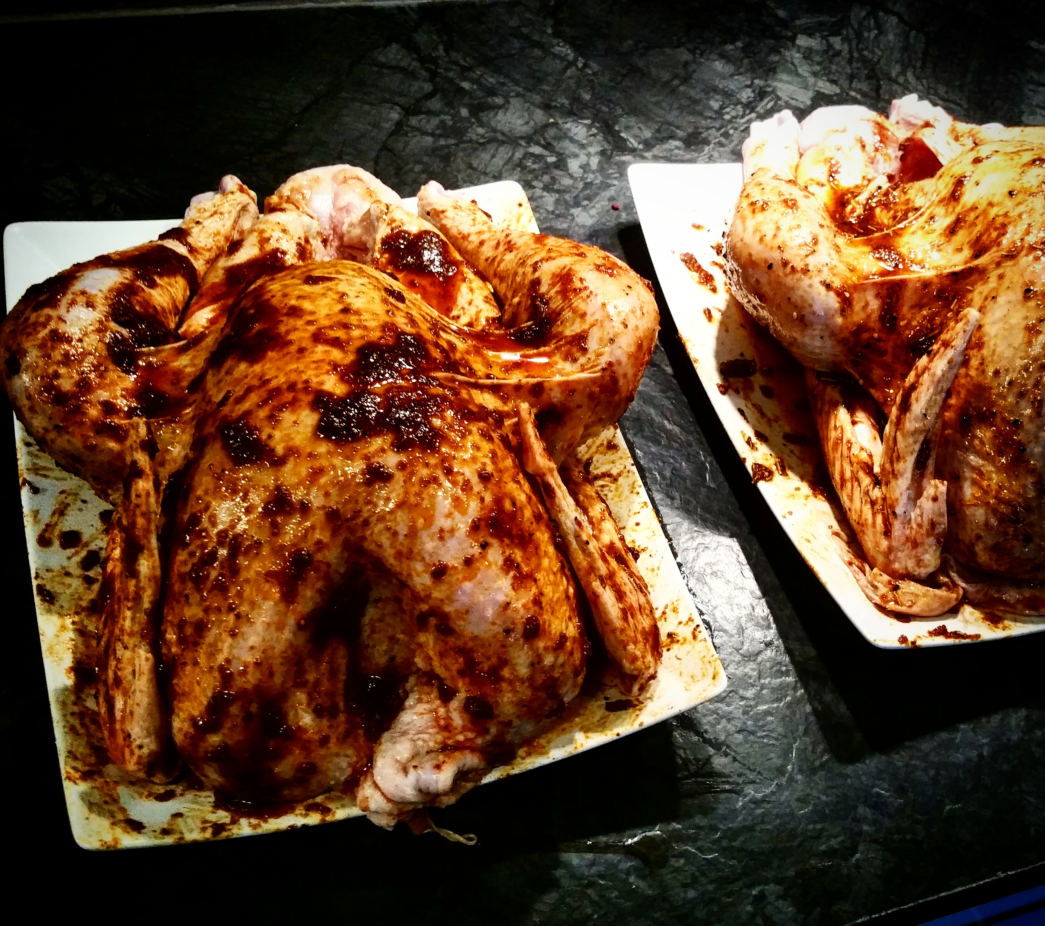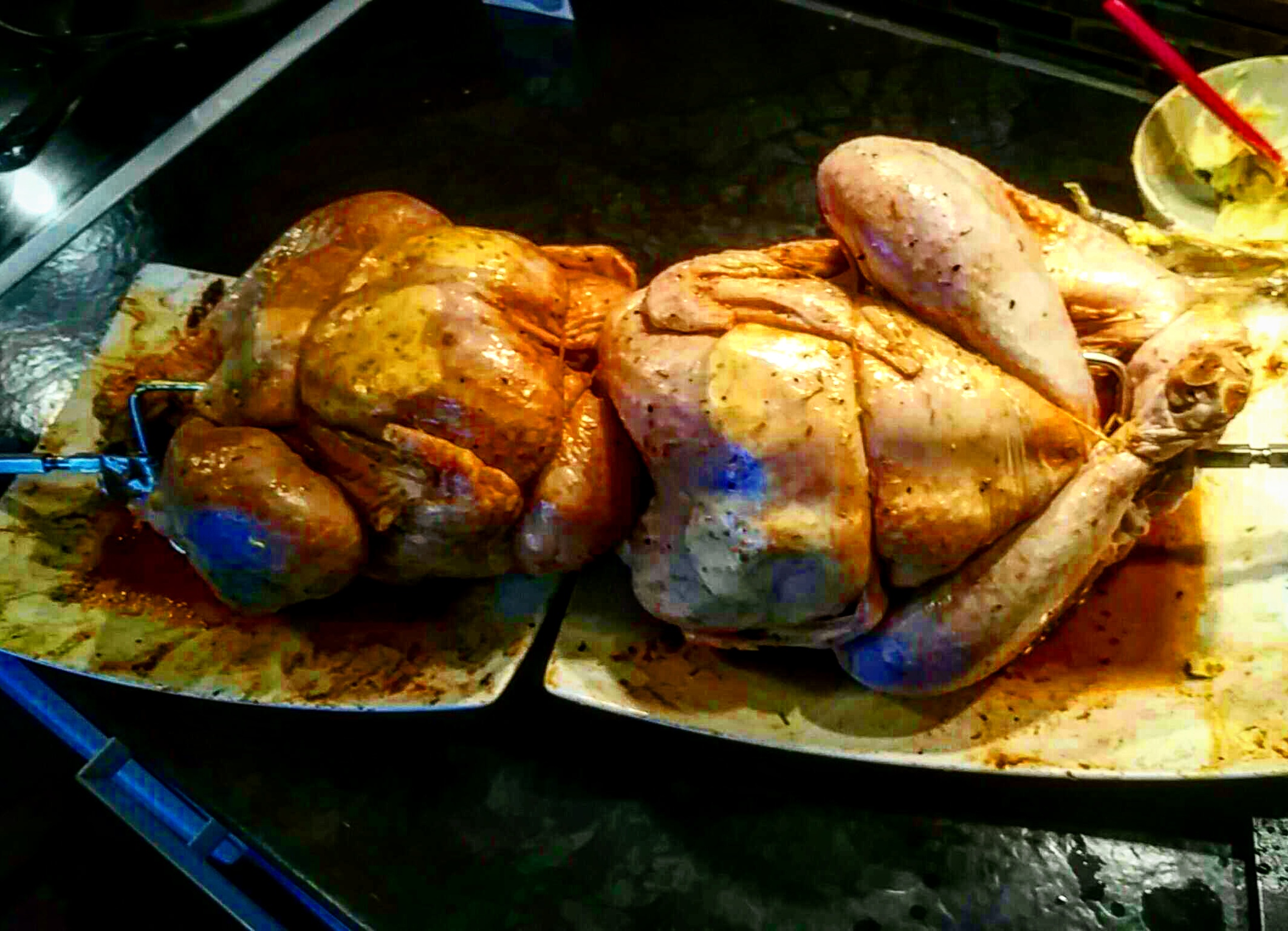Viktigt om du ska tillaga mer än en kalkon eller kyckling samtidigt är att försöka hitta fåglar i samma storlek. Det underlättar vid tillagning då dom har ungefär samma tillagningstid. I detta receptet figurerar två stycken kalkoner på ca 4,2 kg styck. Rotesserien på grillen fick jobba lite.