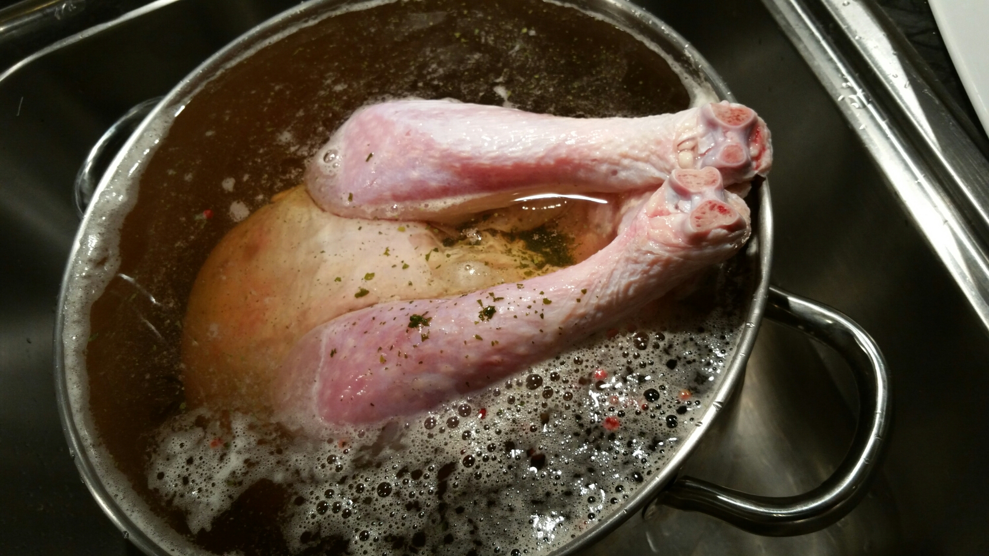 Koka ihop alla ingredienserna på spisen så att salt och socker löser sig. Låt svalna och häll sedan över kalkonen. Ställ svalt.