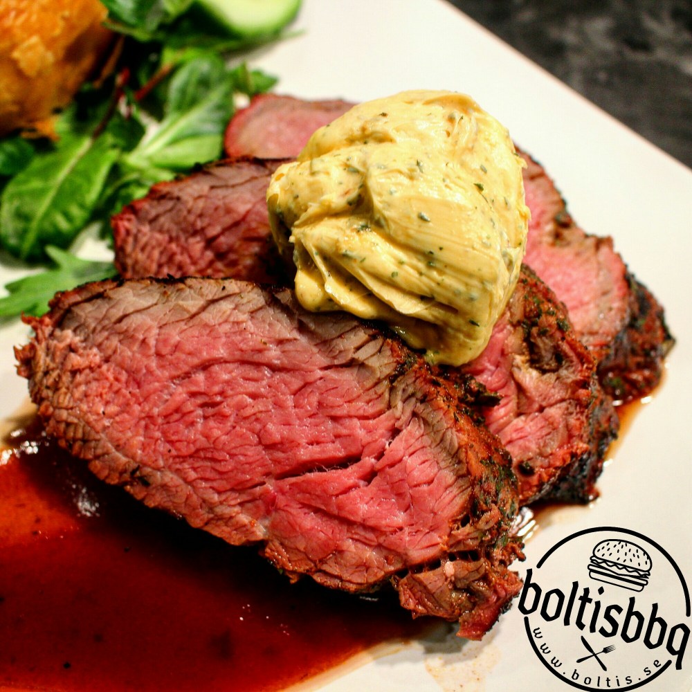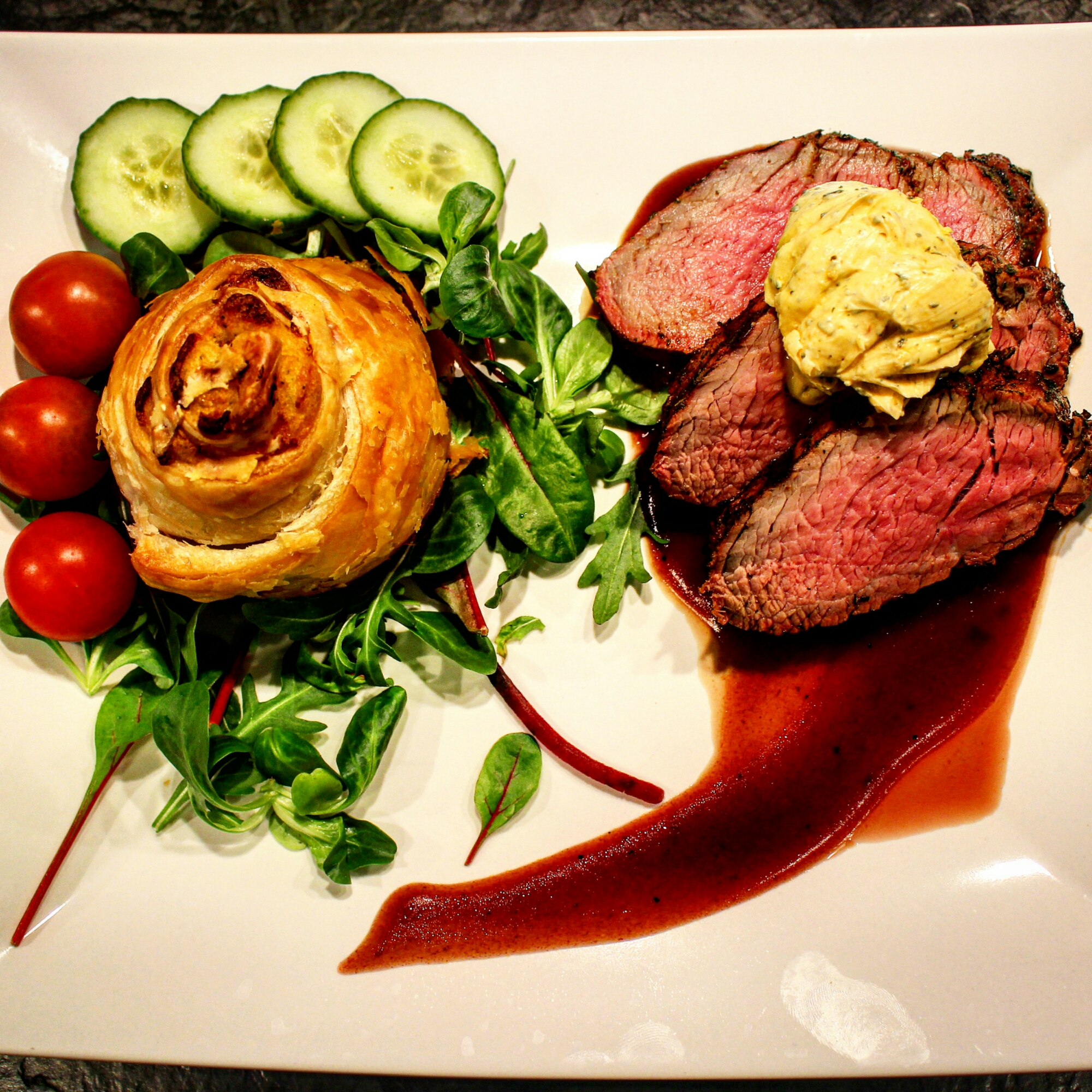 Årets bästa grillning! Konstigt nog dessutom den första. Varit krasslig i veckor nu och inte riktigt orkat. Nåväl. Marinerad oxfilé. Vilket jag inte brukar göra med kött av denna kvalisort men så blev det denna gång. En örtinspirerad marinad med lite hetta från bla Sriracha och vitlök. Sedan rubbad med persilja och blandade franska örter. Grillad indirekt till ca 53 grader och sedan körd direkt för lite yta. Familjevänligt! Serverat med smördegsbakelse fylld med kryddig potatispuré, en röra med stekt korvkrisp, inlagda smålökar och cheddarost. Reducerad portvinssås och lite sallad, tomat och gurka. Och så givetvis ett riktigt hett vitlöks och persiljesmör. Gott!