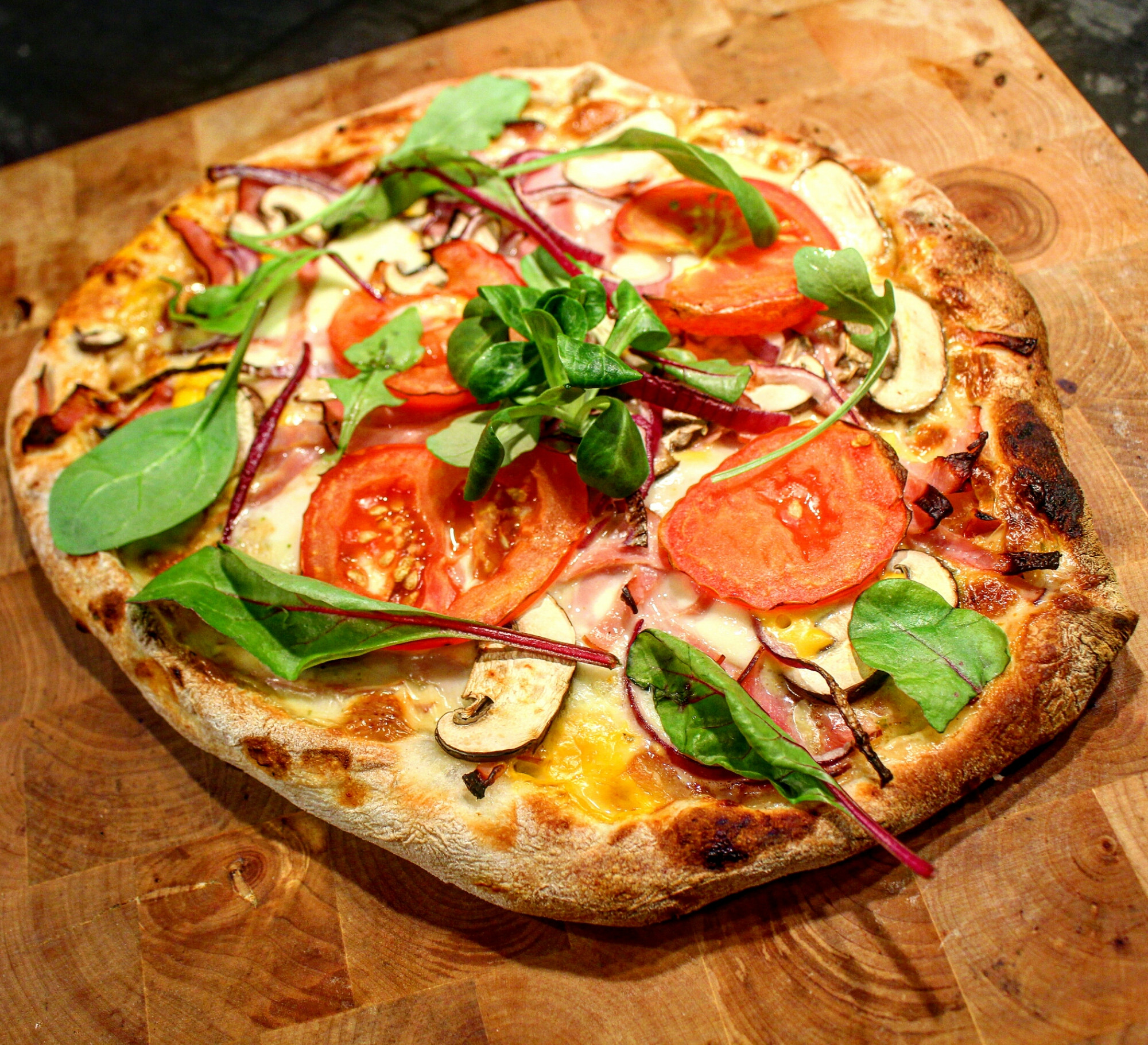 Kanterna på den hemmabakade och kalljästa pizzadegen fylldes med jalapenoost. Toppad sedan med riven cheddarost, mozzarellaost, rökt skinka, kallrökt och lufttorkad skinka. Champinjoner, rödlök och lite tomat. Lite sallad på toppen. Mycket bra resultat! För recept se under bilderna.