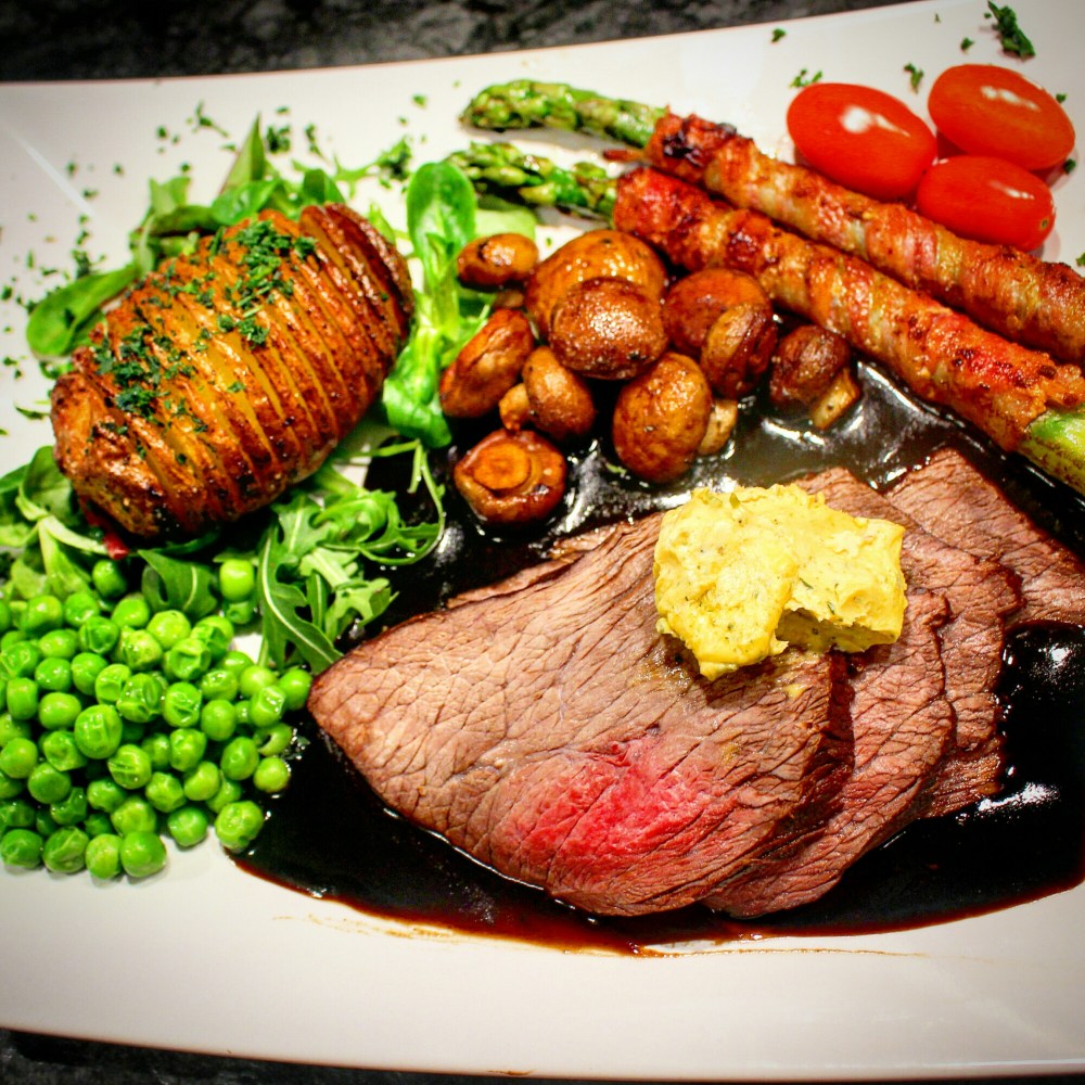 En portersås med portvin, porteröl, svartvinbärssaft, schalottenlök och rödlök. Bland annat. Hasselbackspotatis. Gröna ärtor. Smörstekta champinjoner och baconlindad sparris. Lite kryddsmör. Inte alls dumt.