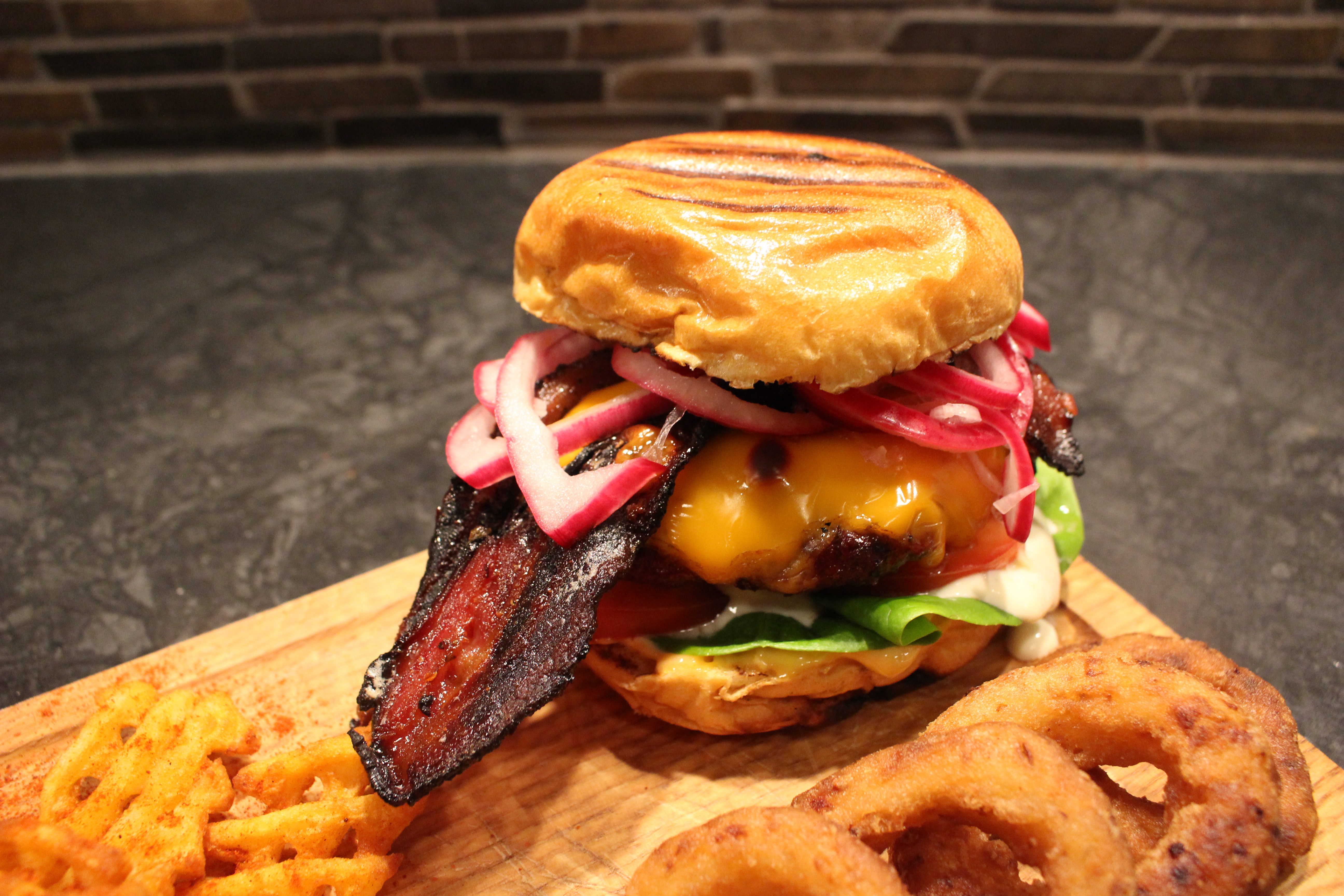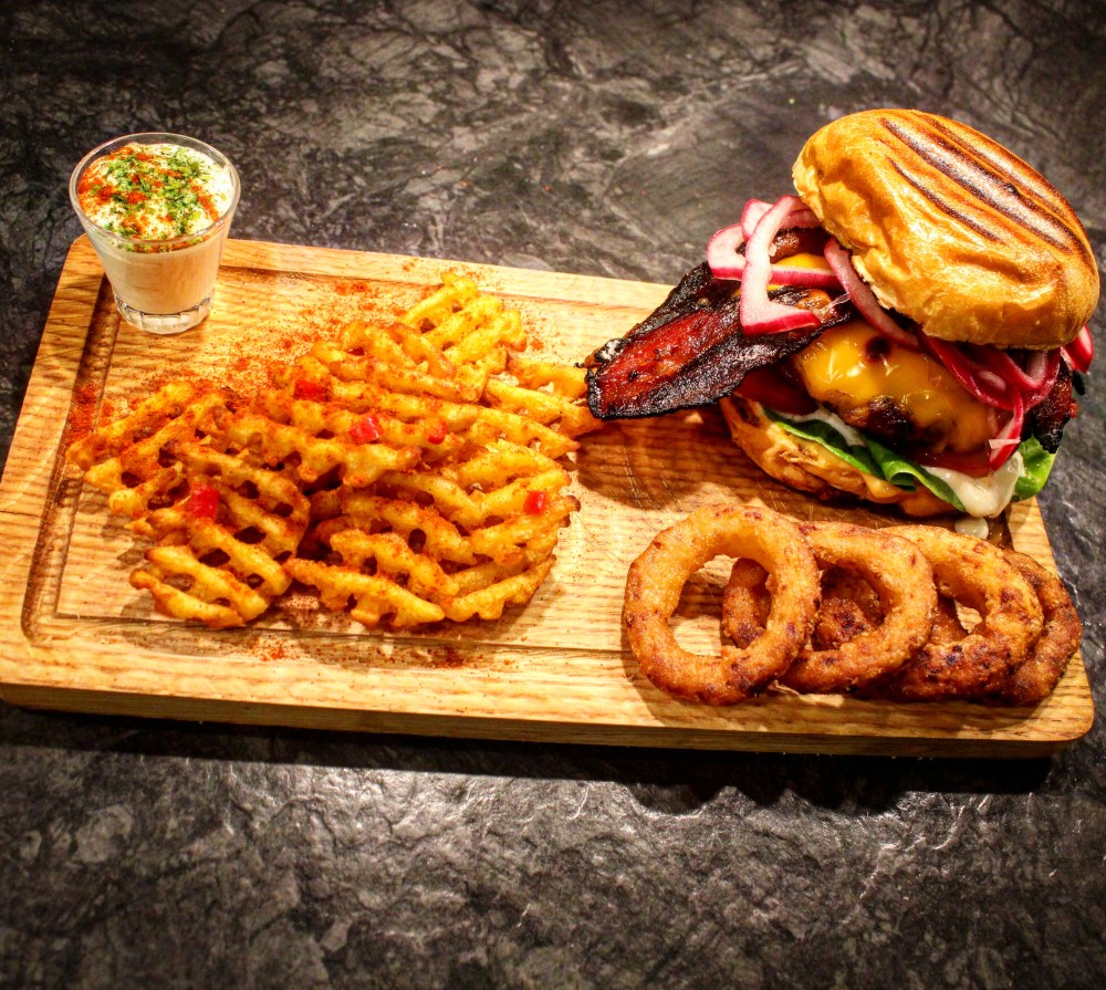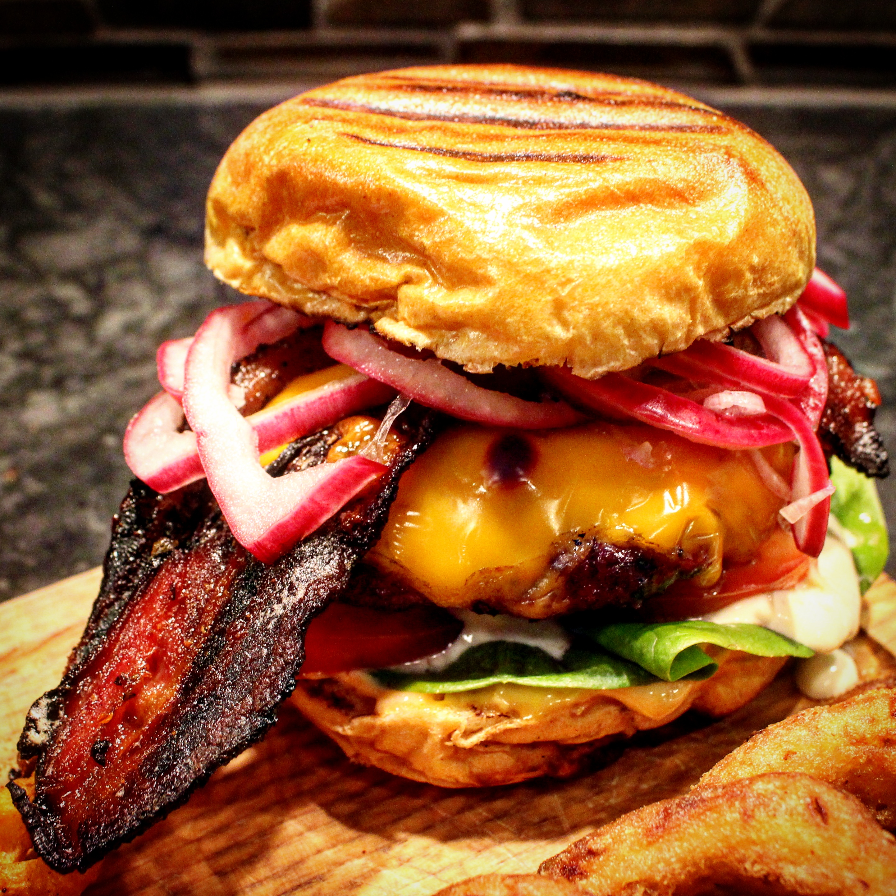 Burger Sunday – The way I like it. Nu kliver jag på några tår tror jag. Men grillat för mig är något som faktiskt smakar just grillat. Jag är lite allergisk mot att trycka ut en bit färs på en stekhäll och stekgrilla den i 3 minuter. Blir ju saftigt och gott med tanke på fett osv men det gör jag lika gärna på stekjärnet i köket. Här har burgarna först gått indirekt med rökchunks av körsbär och mesquite. Sedan snabbt på för ytan och sedan ost på och indirekt igen. Här snackar vi smak. Baconet ser ”bränt” ut men det är det faktiskt inte. Vet inte vad man ska kalla det men karamelliserad bacon kanske? Den är alltså penslad med en röra med bla honung, chili, rörsocker, vitlök och en stark chilisås. Får sedan gå indirekt på grillen. Nästan konstig konsistens med en krispig utsida och ett mjukt inre. Salt, sött och starkt på en gång. Gott! Annars är det briochebröd, hamburgerdressing, sallad, aioli, tomat, burgaren med cheddarost, bacon och picklad lök och chili. Serverat med köbepotatis och lökringar. Och så lite aioli till.
