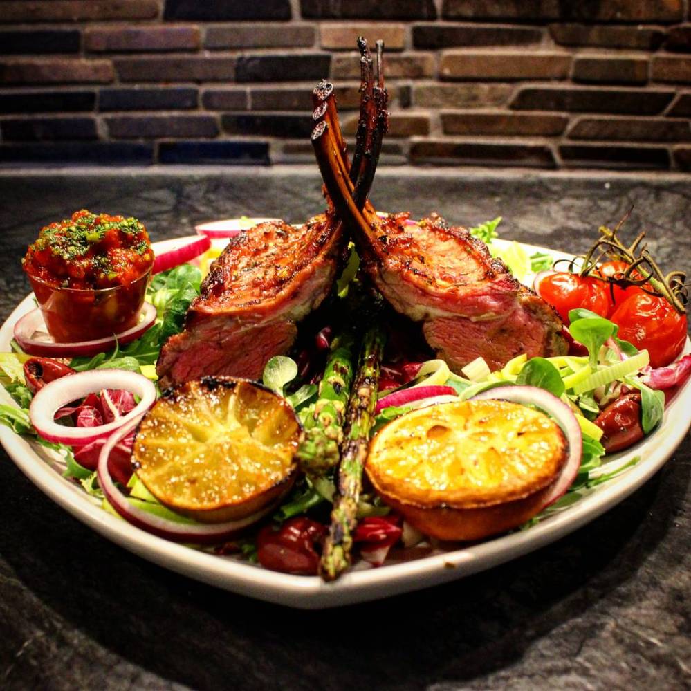 Lamm med sallad. Lammracks som marinerats i olja, timjan, oregano, vitlök, balsamvinäger, flamengo chilisås, honung och lite salt. Grillad reverse sear med körsbärschunks. Serverat på en salladsbädd med rödlök, purjolök och kalamataoliver. Lite grillad lime och citron med socker och chilisås som sedan pressades över köttet. Lite grillad tomat och mojo rojo. Inte så dumt.
