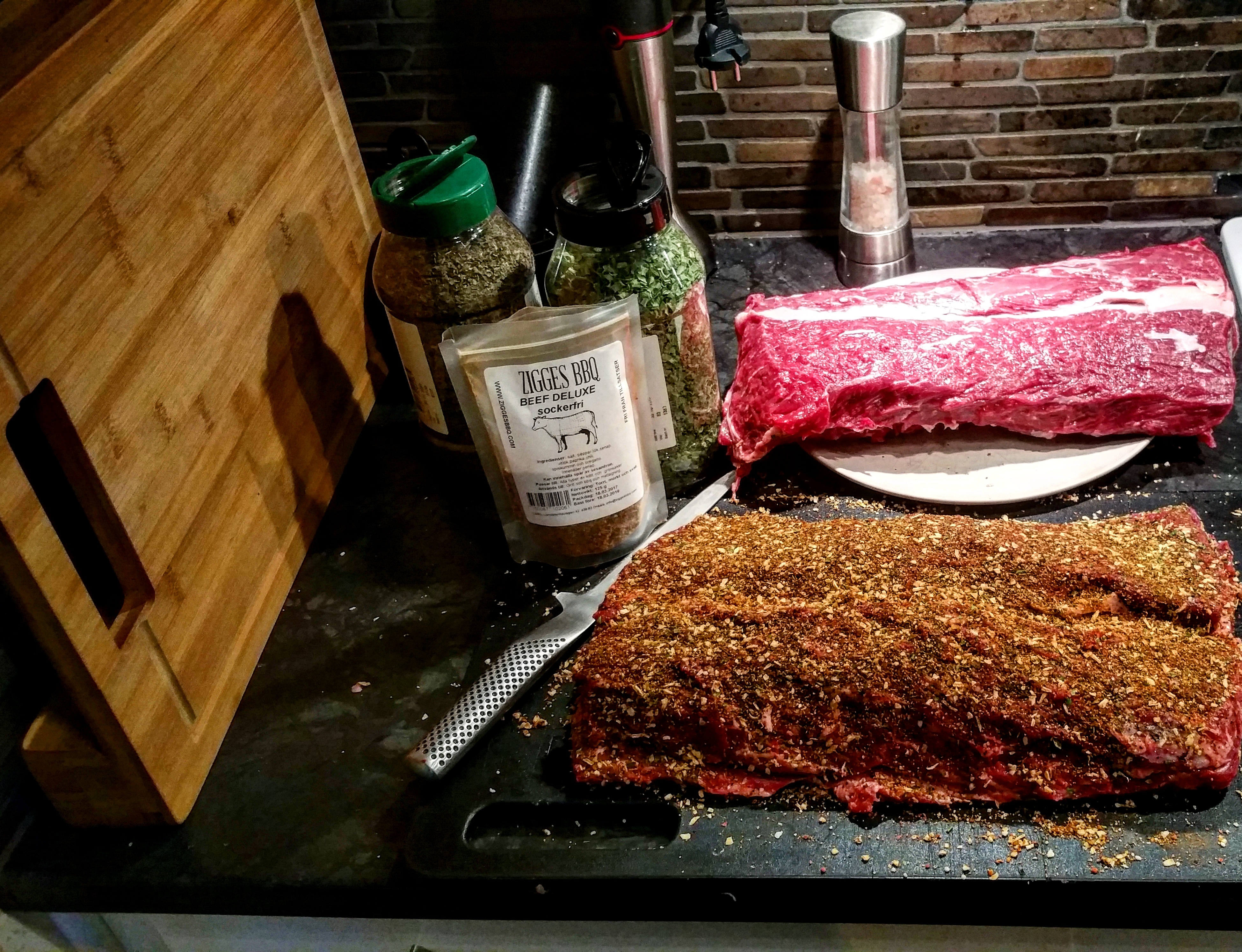 Mat o Recept Rökt entrecote Publicerat av boltis on 6 april, 20176 april, 2017 Ja. Torrt var det inte. Entrecote rökt hel i ca 4,5h i wsm med körsbär och mesquitechunks. Låg temperatur och bortplockad vid ca 56 grader. Vila. Bränna på lite för yta. Riktigt saftigt o fint. boltis Skriv ut (Öppnas i ett nytt fönster) Skriv ut Dela på Facebook (Öppnas i ett nytt fönster) Facebook Dela på X (Öppnas i ett nytt fönster) X E-posta en länk till en vän (Öppnas i ett nytt fönster) E-post