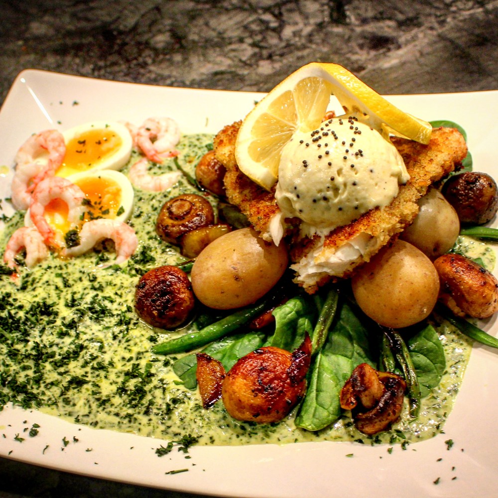 Frun iväg på tantsnusk-bio så fick dra ihop lite mat till mig och ungarna. Helt ärligt bland det absolut bästa jag gjort. Grill or no grill. Tyvärr så visar väl inte bilden rätten från sin bästa sida. Orkade inte photobomba idag. Nåväl. Torskfilé som vi fiskade upp igår pankopanerades och stektes gyllenbrun på medelhög värme. Konsistensen heeelt perfekt. En spenatsås i botten och fisken lades på en bädd av hela spenatblad, stekta haricots verts, champinjoner och gul paprika. Kokt potatis. En senapskräm och citron på toppen. Till och med äggen blev härligt löskokta och lite handskalade räkor fick bli lite topping