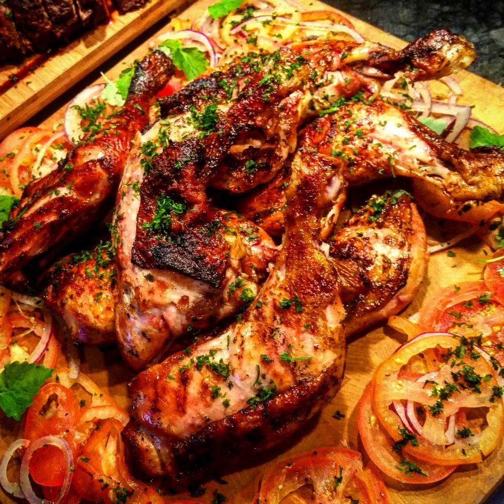 Eftersom jag var osäker på om 5,4kg entrecote skulle räcka så blev det ett par kilo kyckling med. Rökta med samma förutsättningar med körsbärs och mesquitechunks. Låg först i en brine med bland annat päroncider och citron. Sedan rubbade med en Texas wing rubb. Blev väldigt bra.