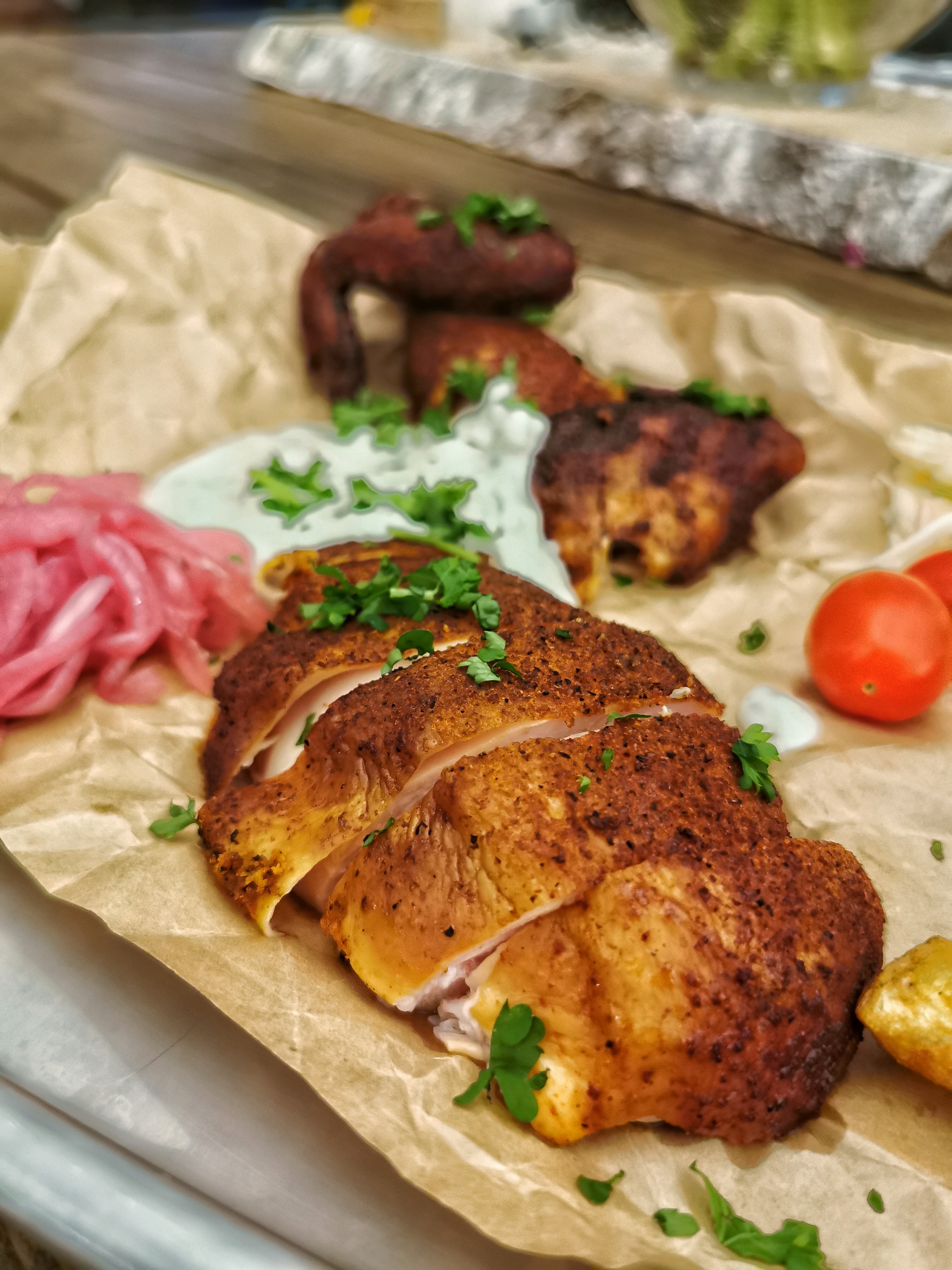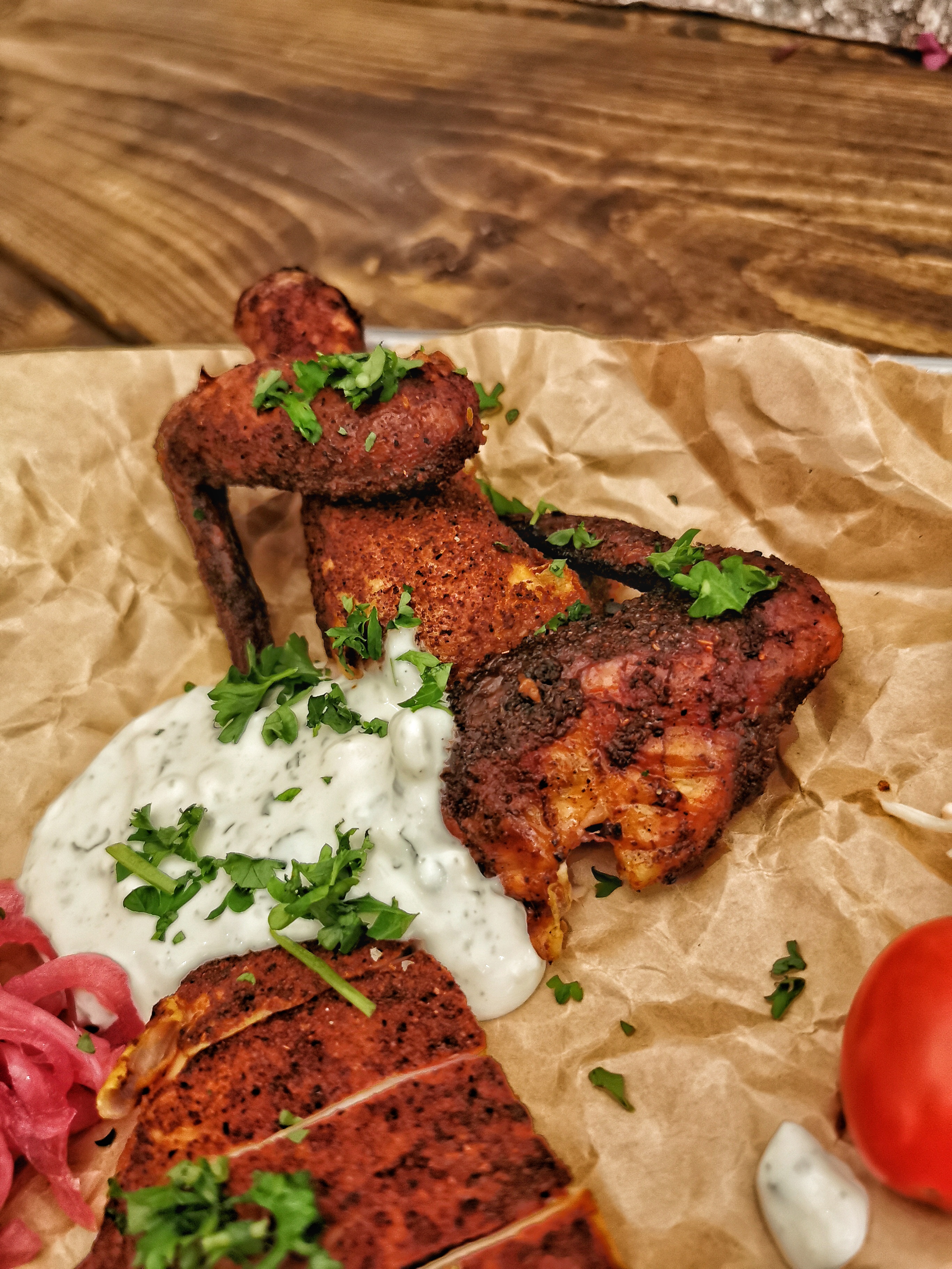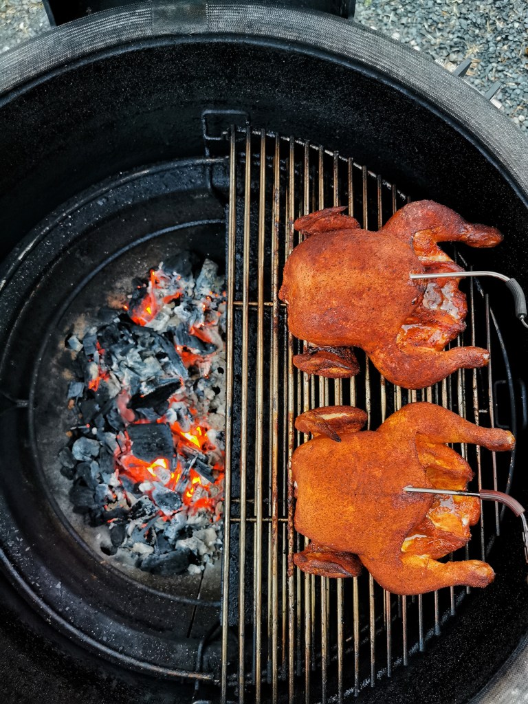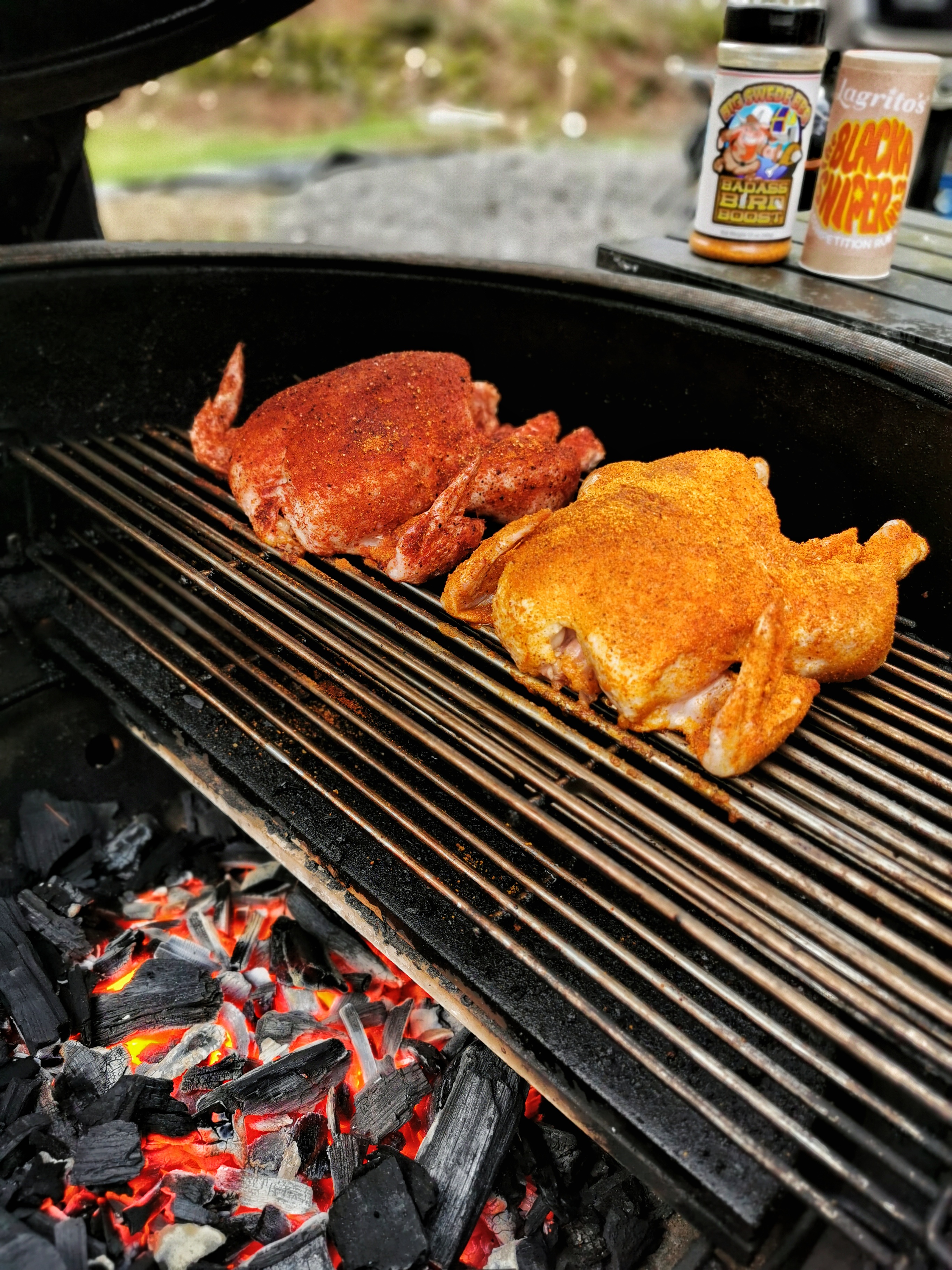 Helgrillad kyckling. Snabbversion där de bara är rubbade med varsin god krydda. Blacka Sniper No 3 från Lagrito’s och Bad Ass Bird Boost från Big Swede.