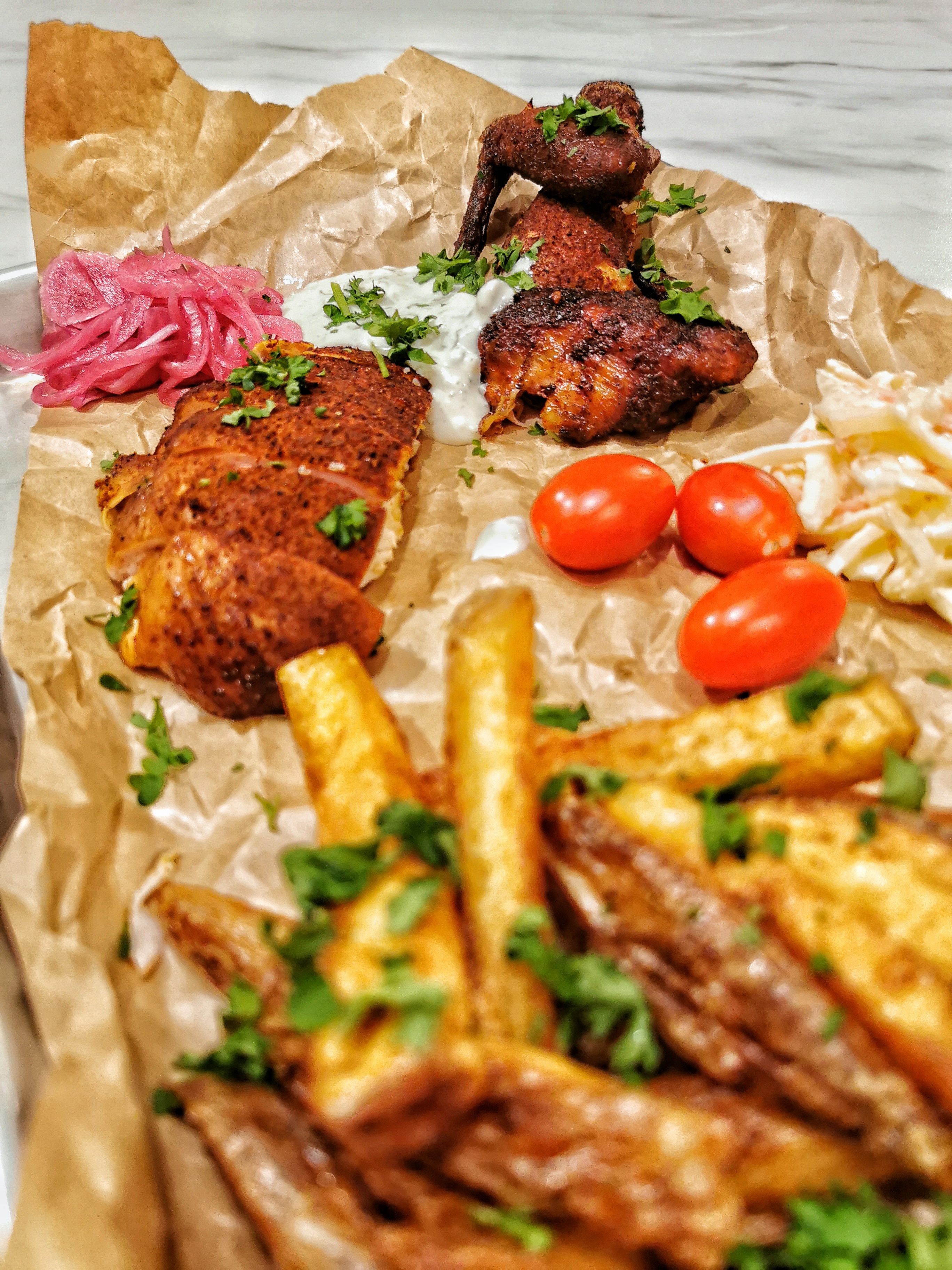 Det blev inte riktigt som jag planerat från början men riktigt gott ändå. Serverades med hemmagjorda pommes, en blue cheesedressing med Saint Agur mögelost, coleslaw, picklad rödlök och tomat.