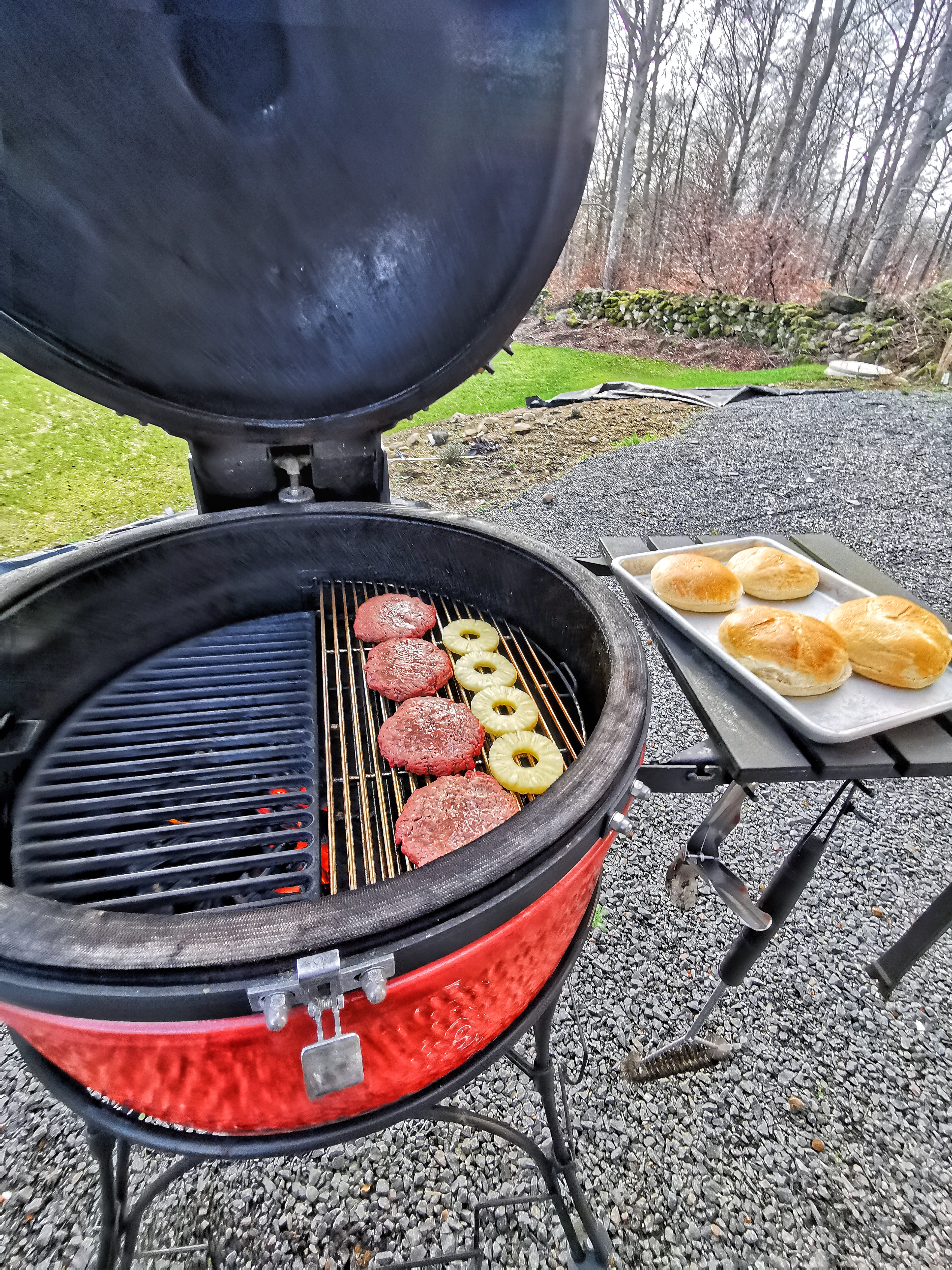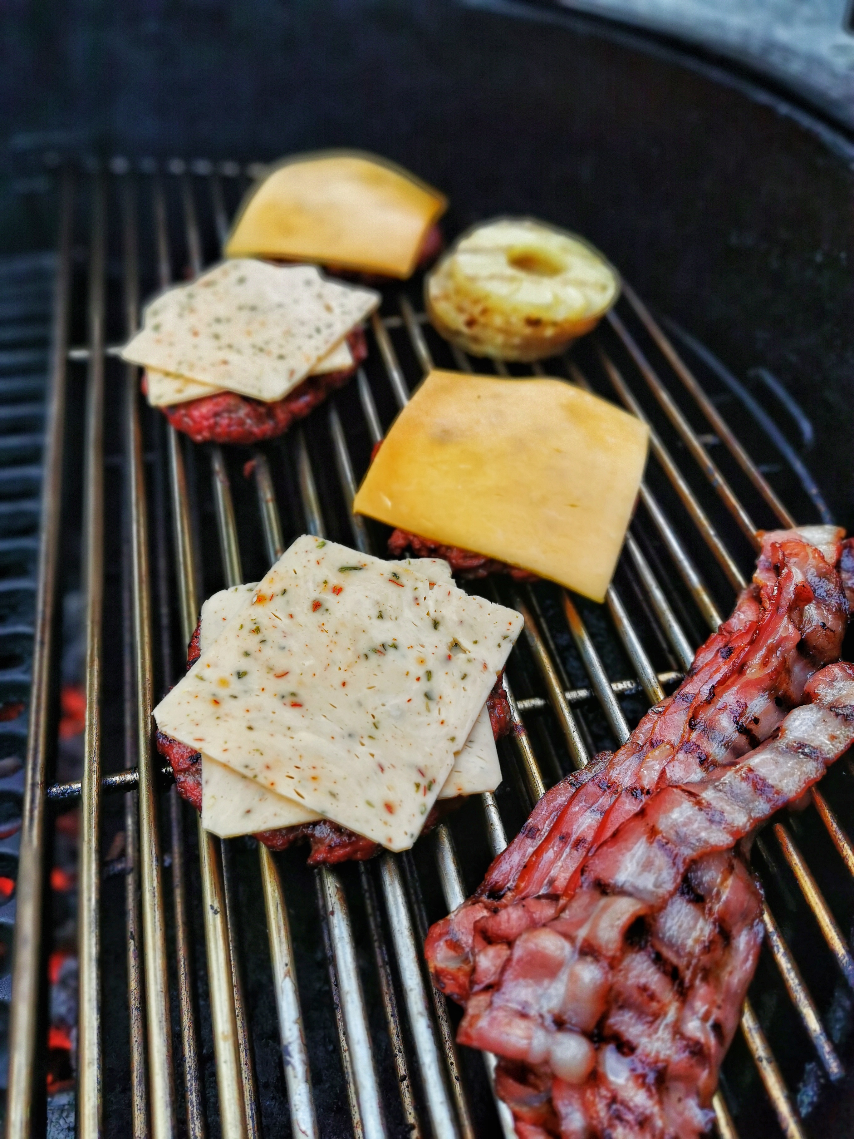 150 grams nötfärsburgare som för en gångs skull inte smashades utan gallergrillades. Först indirekt tillsammans med lite rökpellets och sedan direkt på gjutjärnsgaller.