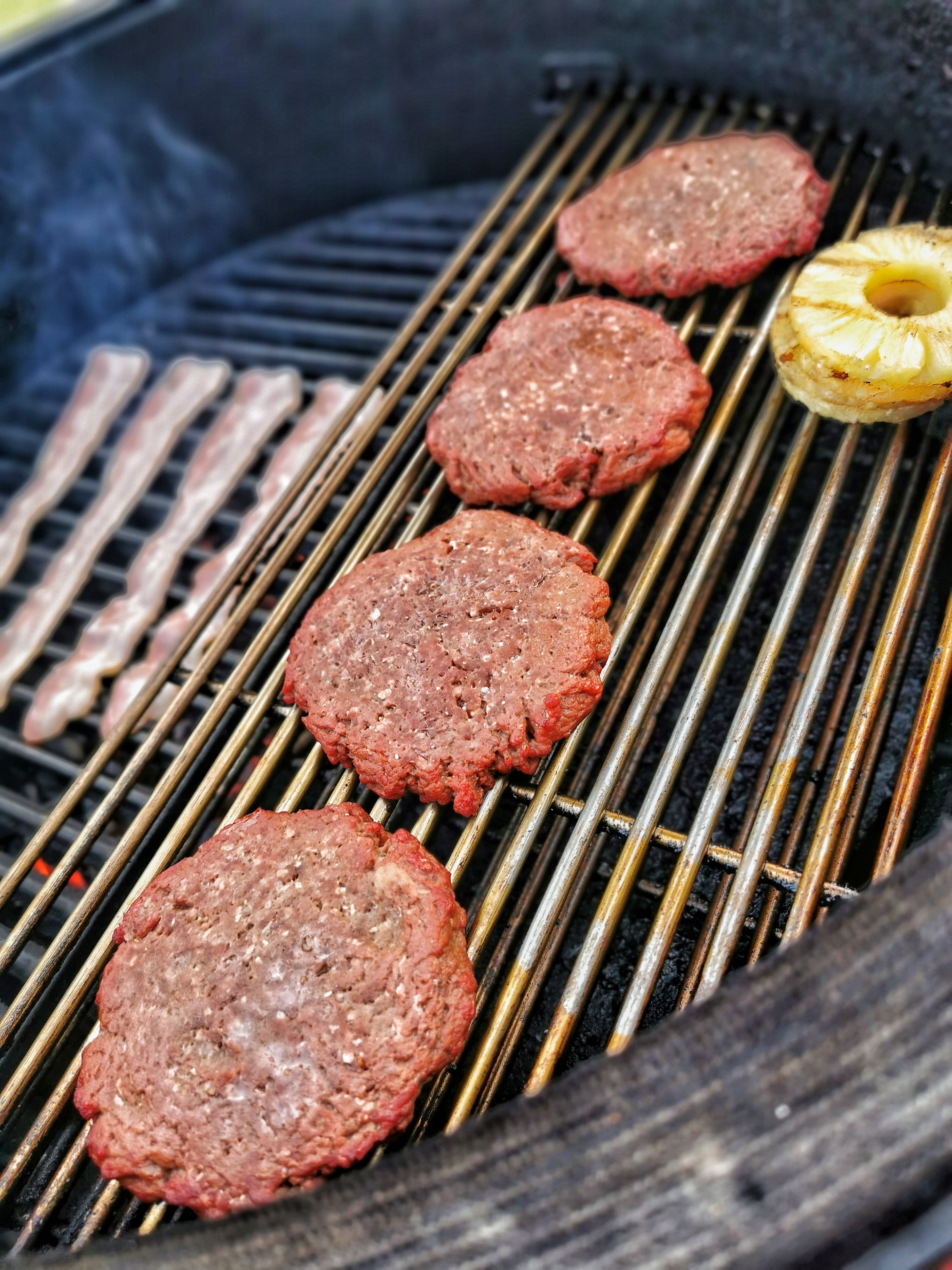 Grillad ananas som penslades med Chilihonung från Simonsens Farm. Rejält med en mild Jalapeno relish på toppen tillsammans med några skivor bacon. Majonnäs i locket.