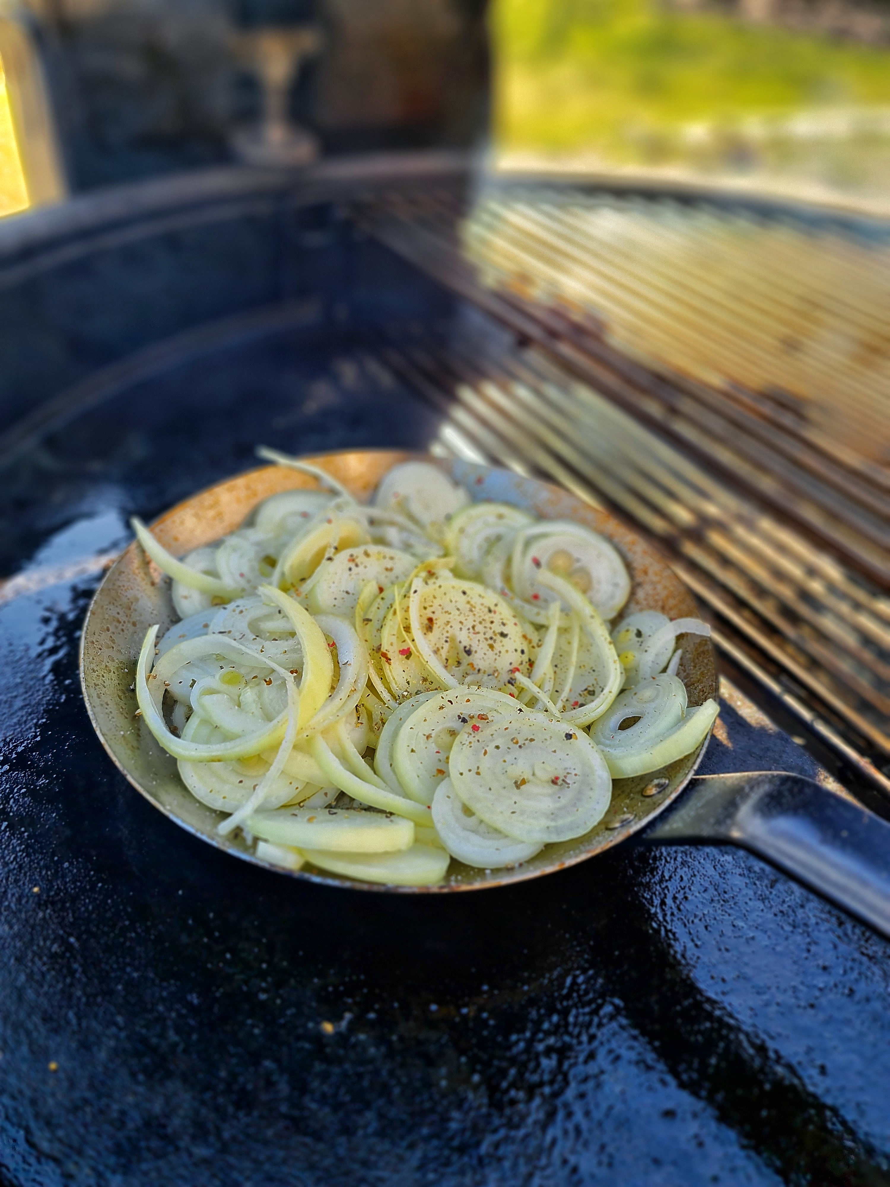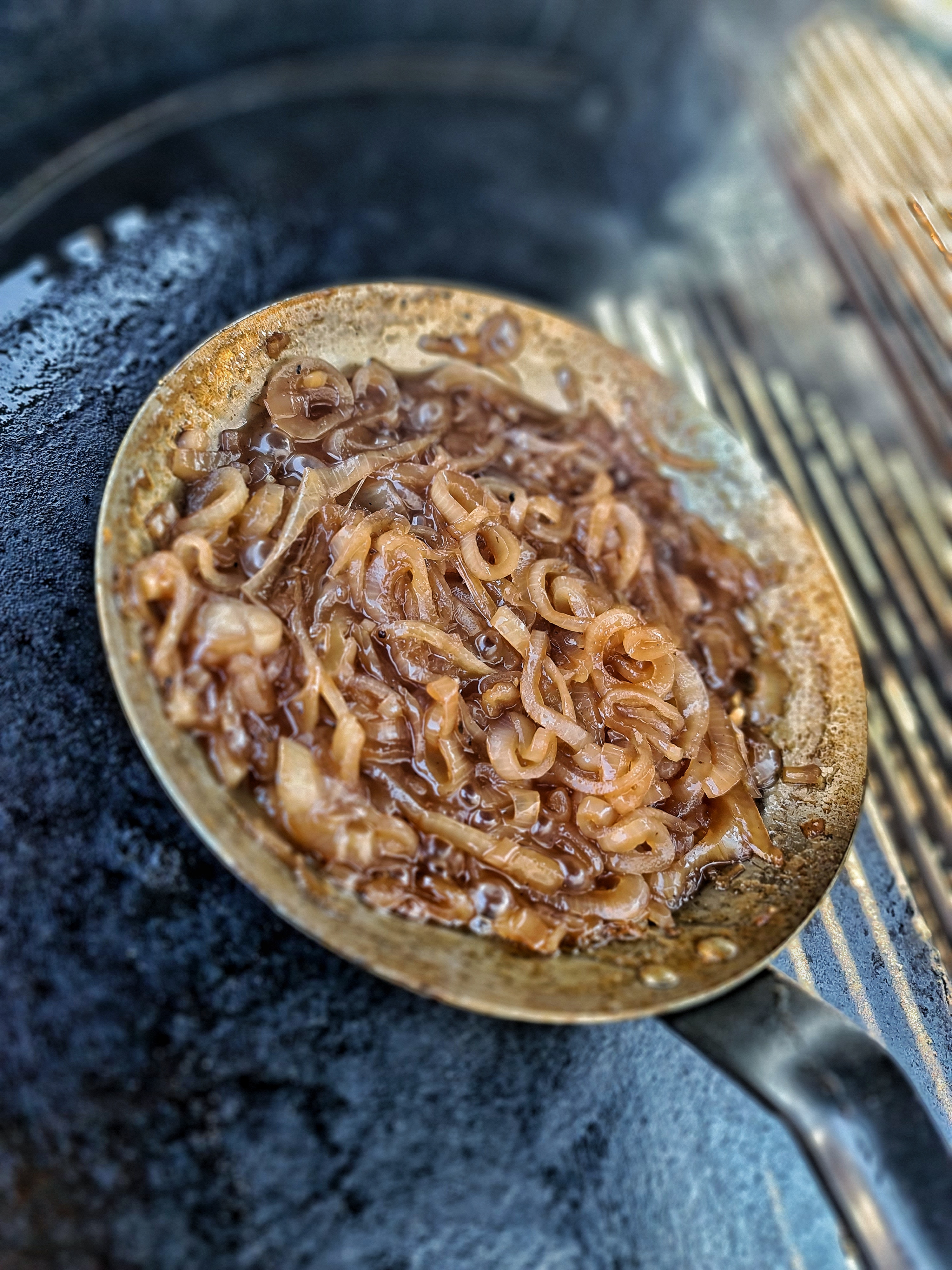Denna typ av lök gillar jag. Gul eller röd lök, öl, vatten, rårörsocker (ja jag gillar det även fast löken blir söt i sig själv) rödvinsvinäger, salt och peppar. Höftar hej vilt. Denna gång öste jag i lite chilihonung från Simonsens Farm dessutom för lite extra sötma och hetta. Låt koka mjuk.