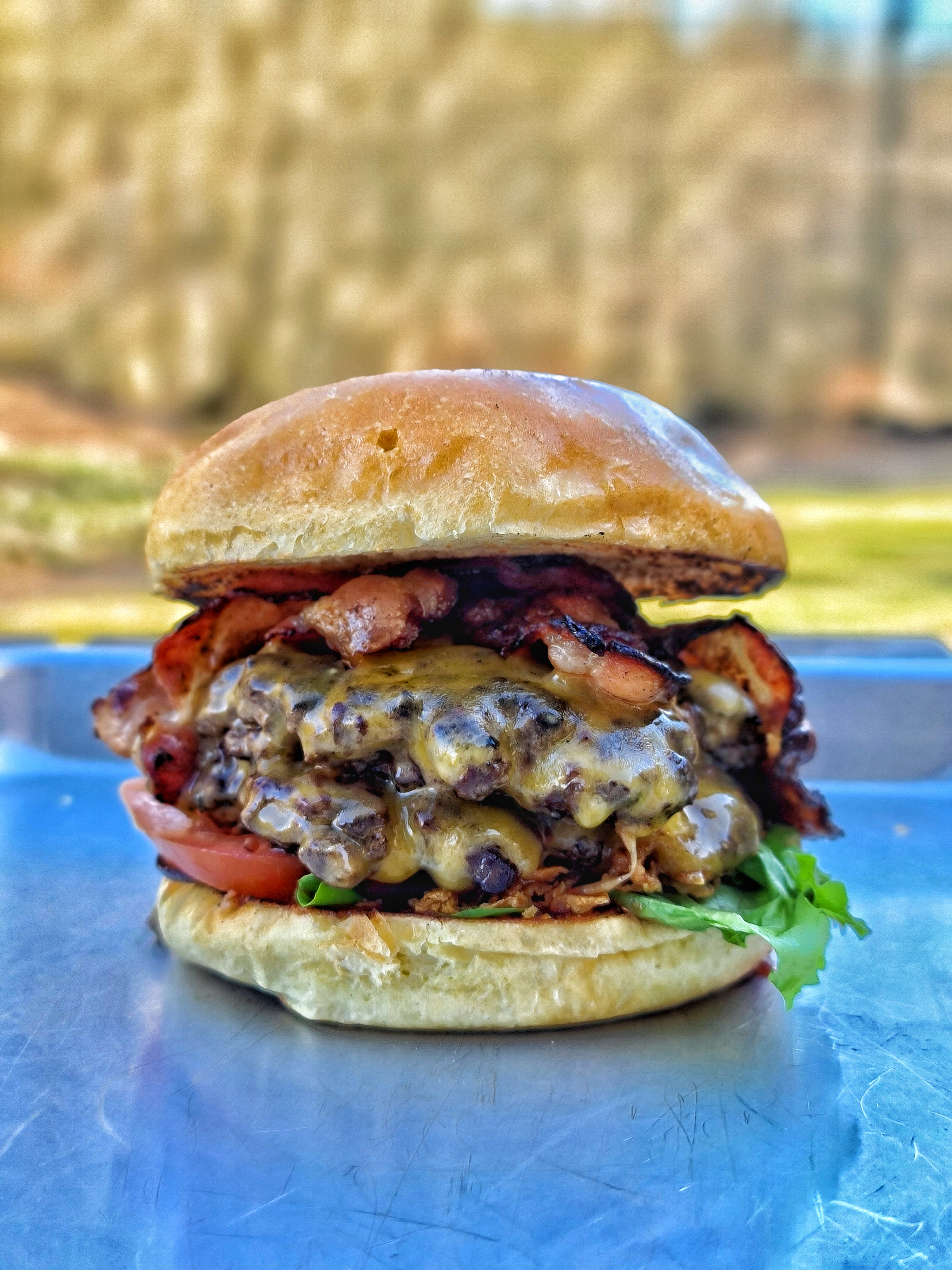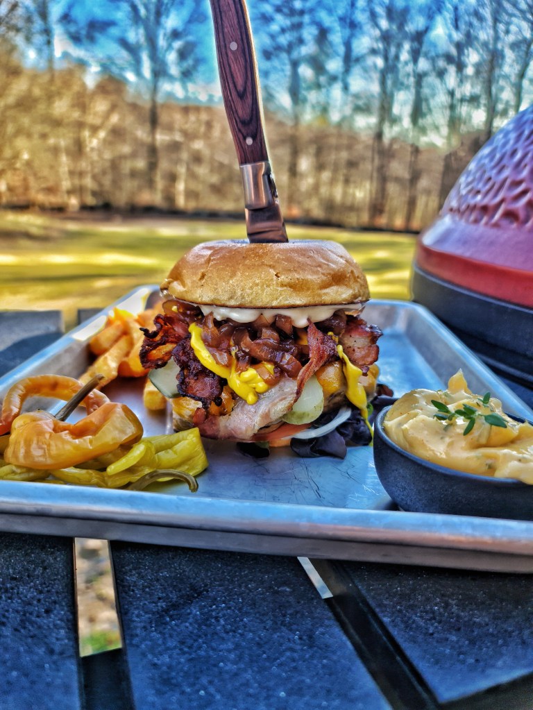 Första tanken var att göra något groteskt och smått vulgärt men det övergick sedan till planen att göra en plain and simple ost och baconburgare. I tanken iaf. Det råkade nog bli ett mellanting.