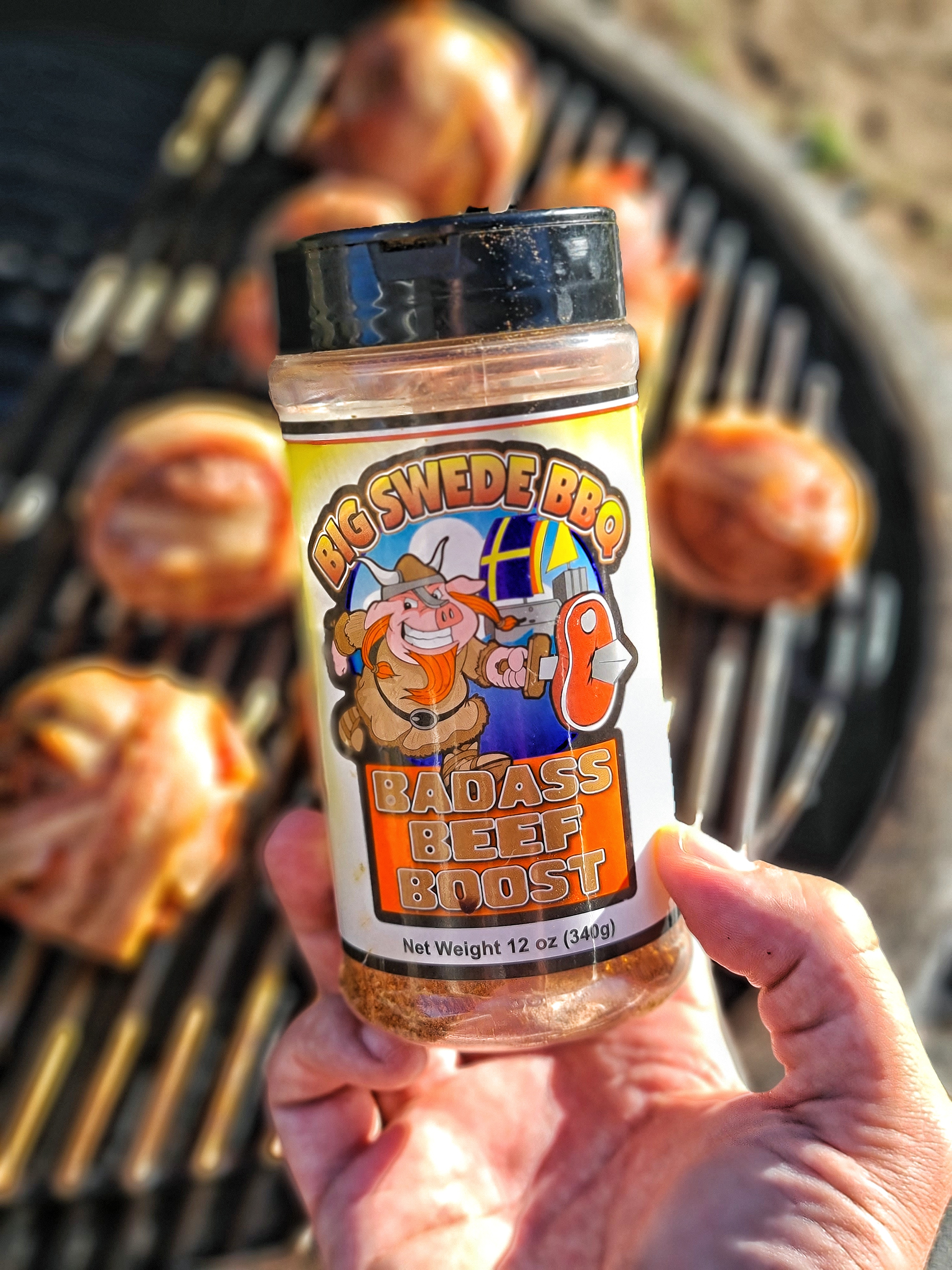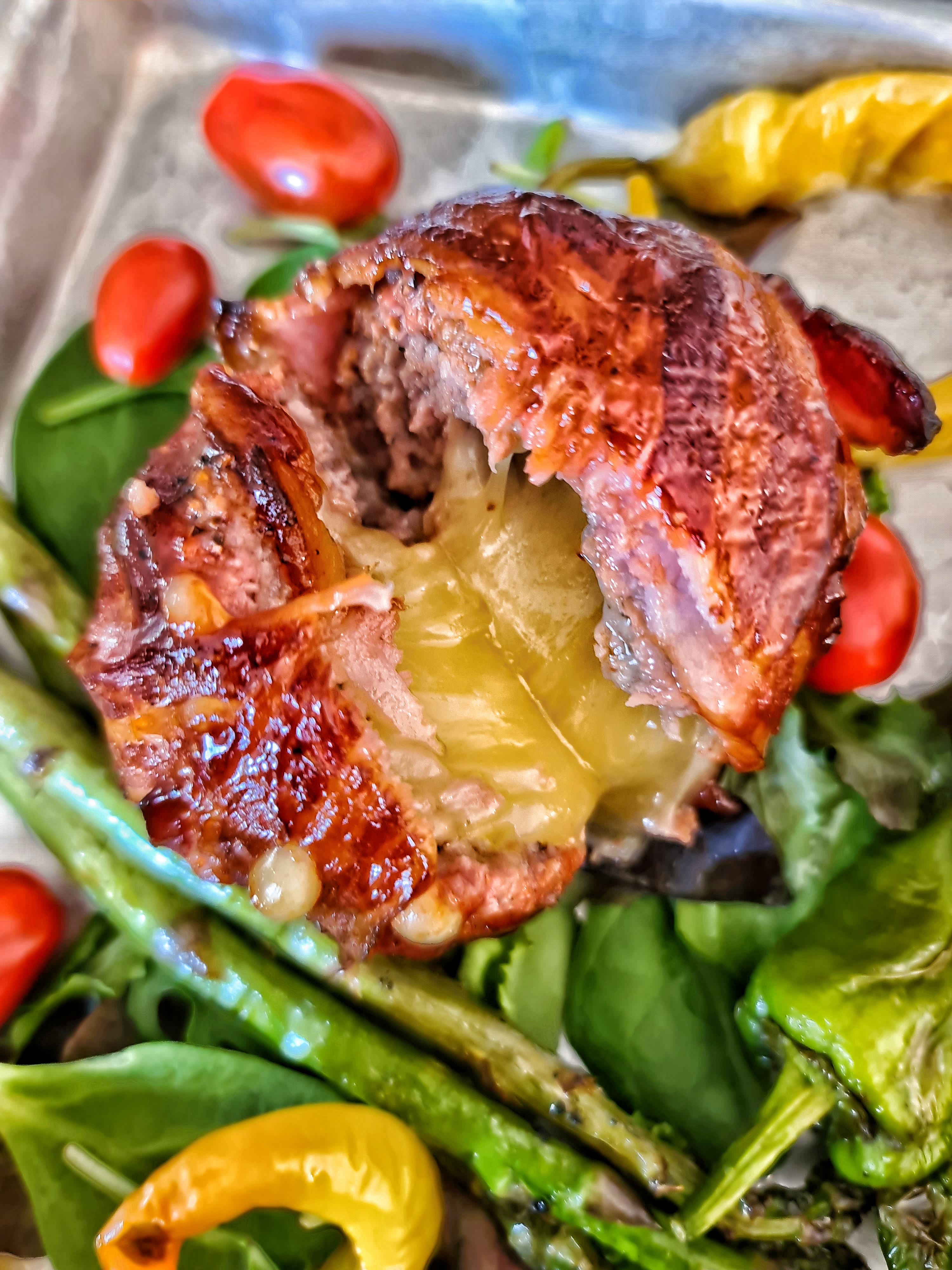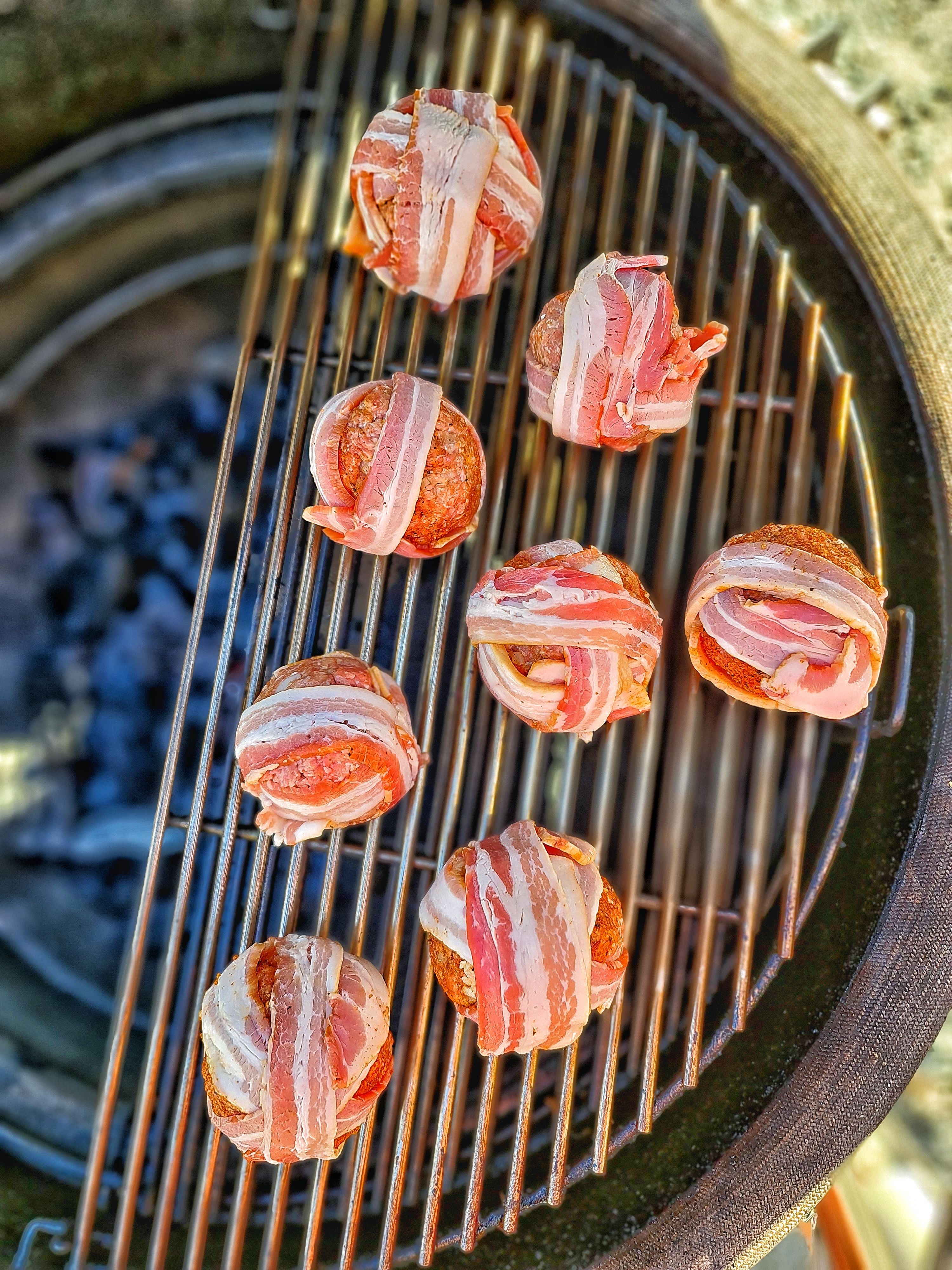 Kvällens grillning då. Kalvfärsbollar rejält fyllda med lagrad cheddarost och sedan baconlindade. Färsen kryddades med Bad Ass Beef Boost från Big Swede och lite finhackad silverlök blandades i.