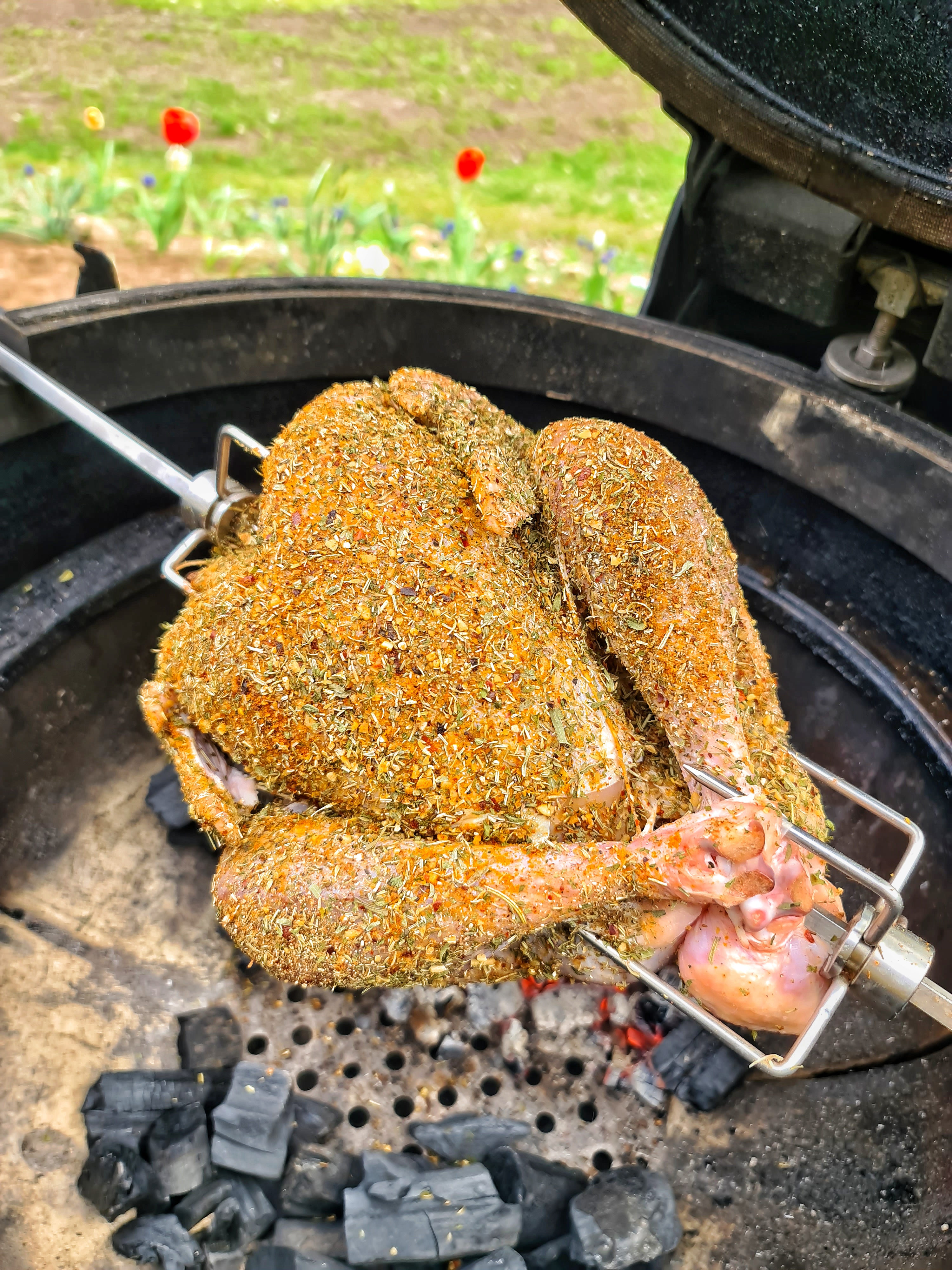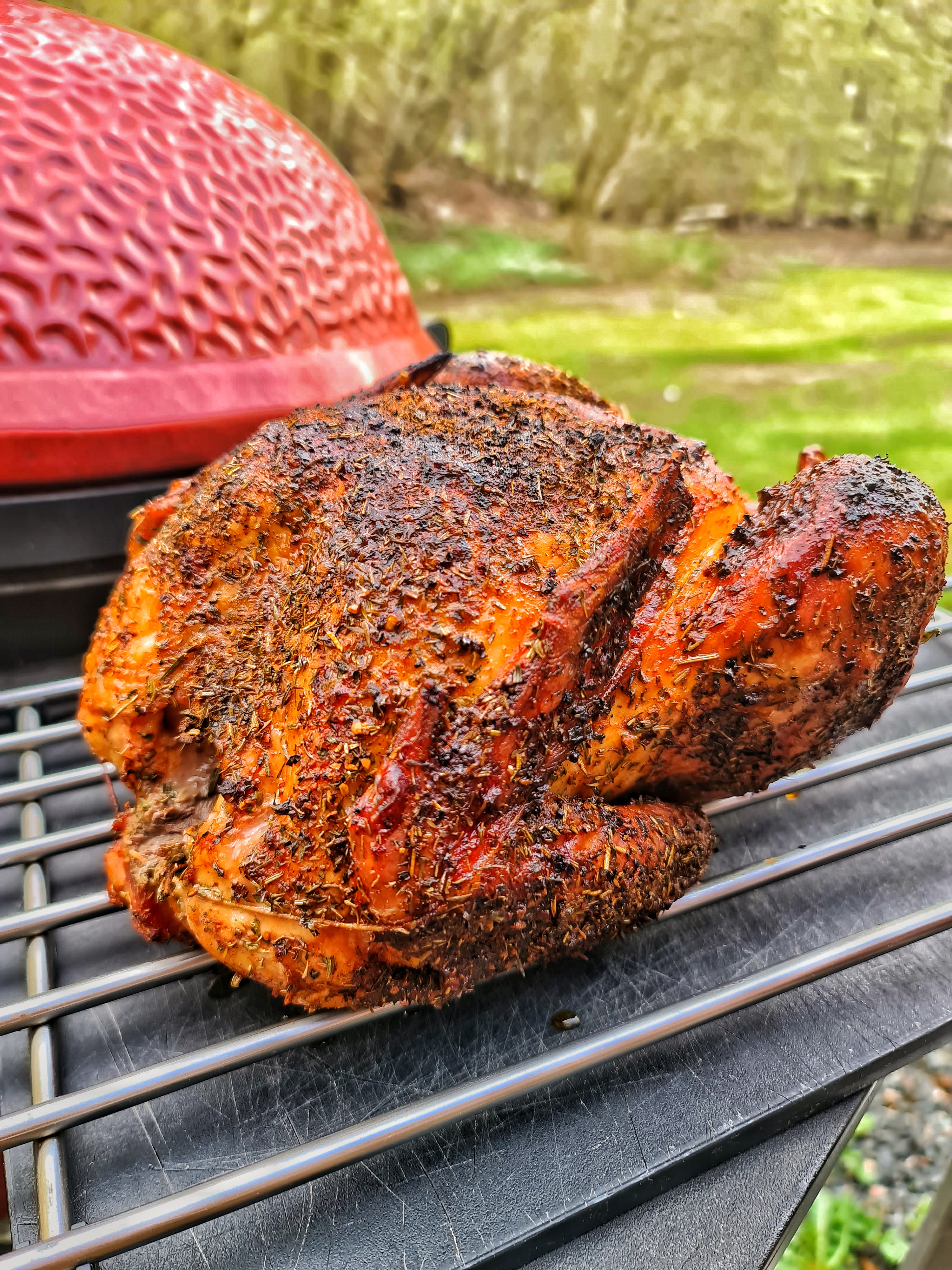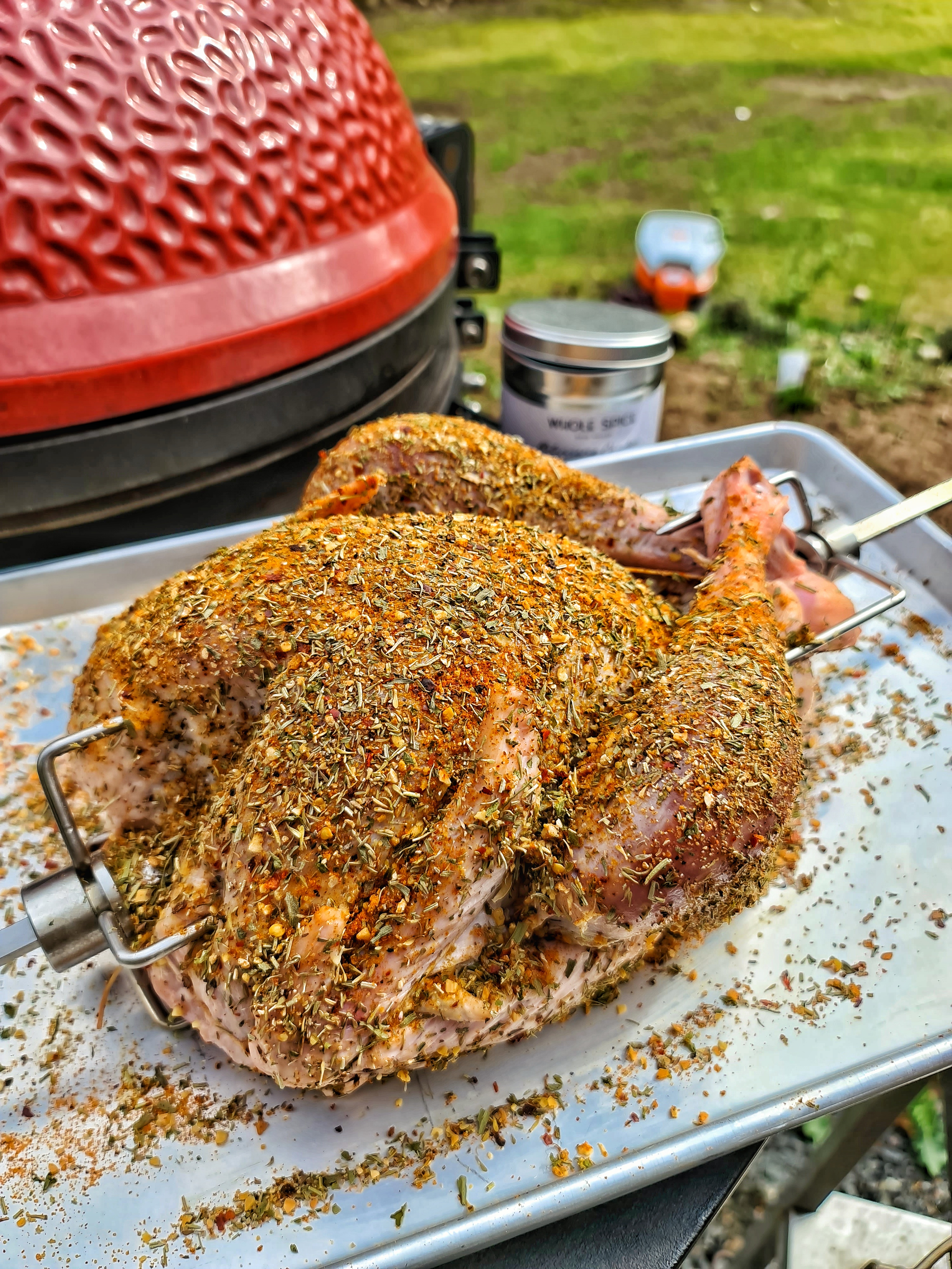 4.6kg kalkon. Rubbad med Chicken Rotisserie Rub från Epic Spice och Badass Bird Boost från Big Swede.