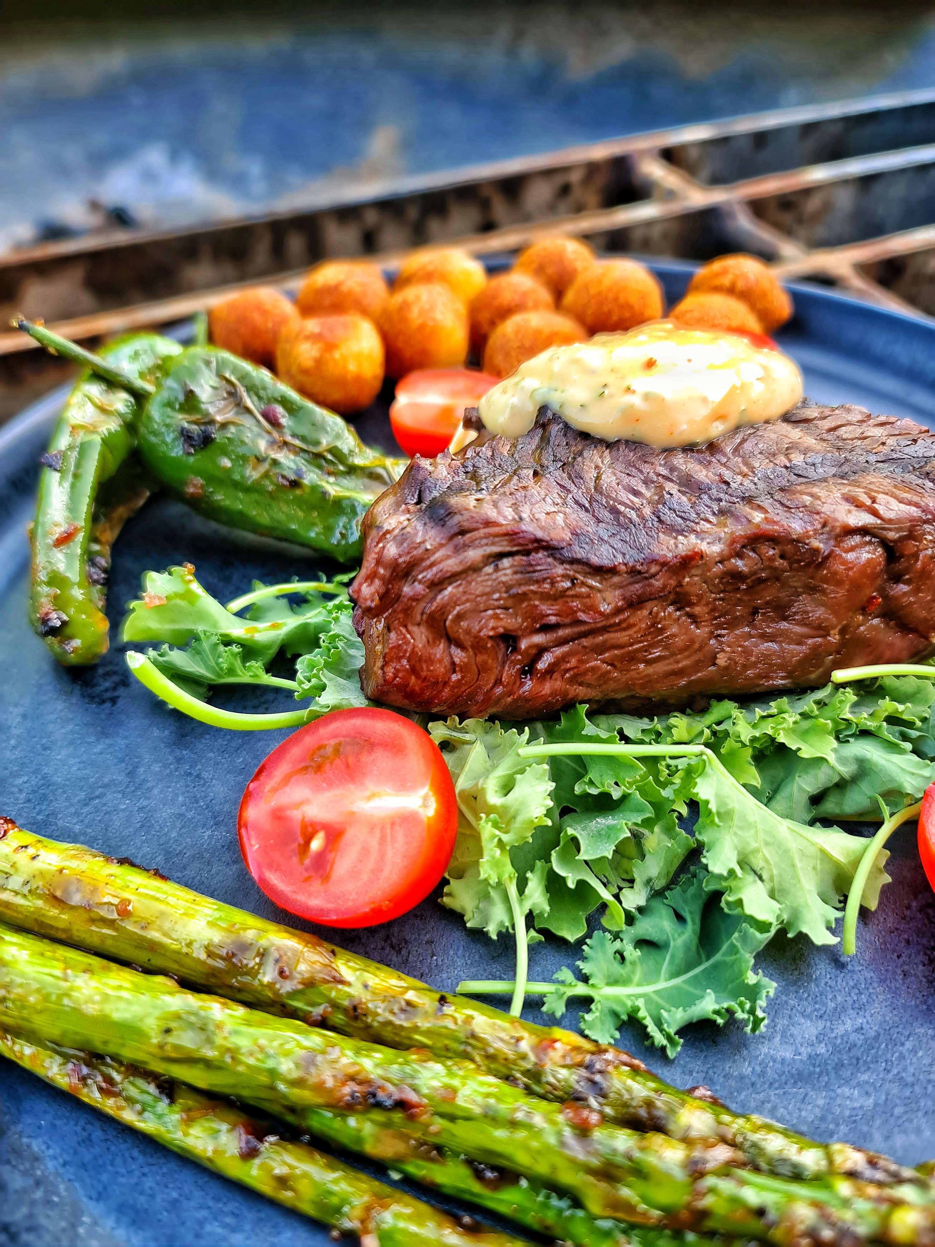 Grillad rostas med potatiskroketter, chilibearnaise, sparris och padrones. Lite finbladig grönkål och körsbärstomater.
