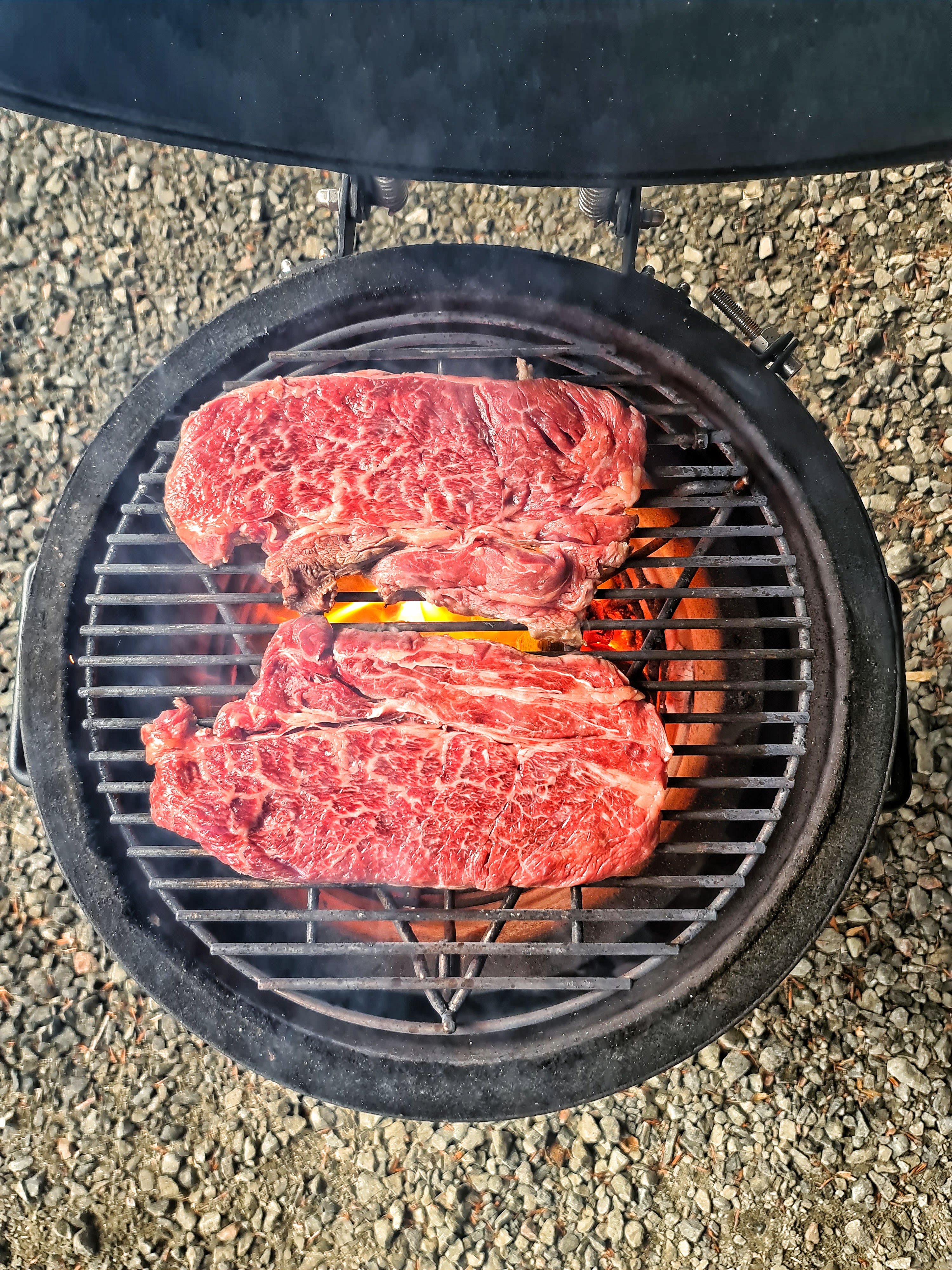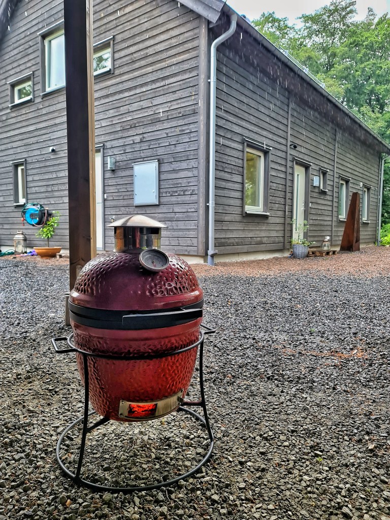 Skönt med en släpbar grill. Inget tak ännu över grillarna och när man konstaterar att regnet öööööser ner blir man ju lite deppig. Då kom idén upp om att man kan stå i carporten som byggs för fullt. Då kröker man rygg.
