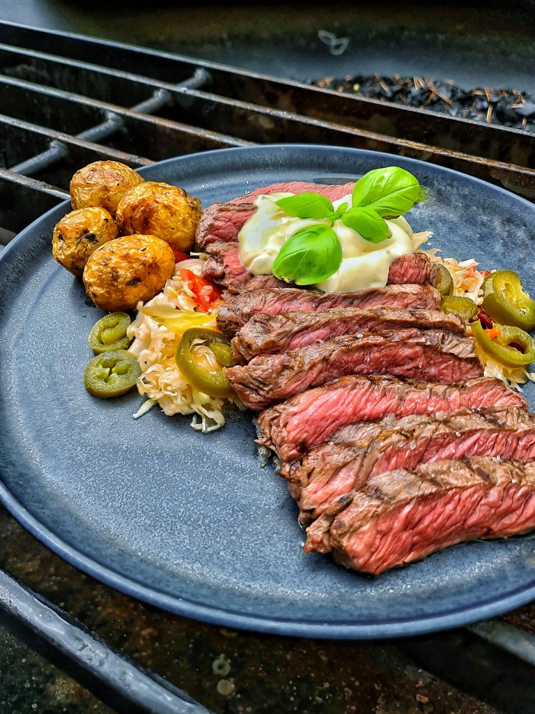 Grillad ryggbiff med picklad sallad a la Balkan innehållandes vitkål, morötter, paprika, gurka, lök och gröna tomater. (ej egengjord denna gång) ugnstekt potatis och en tryffelaioli.