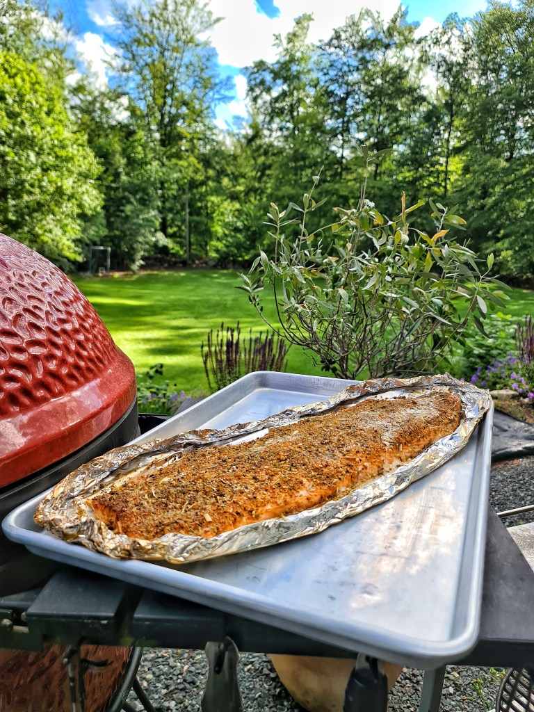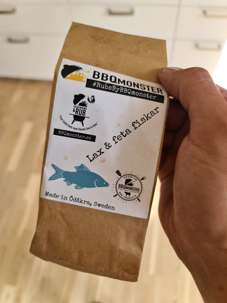 Laxen kryddad med en gammal, gammal krydda jag hittade i lådan från Bbqmonster som är riktigt bra. Lax & feta fiskar. Avtagen på ca 50 grader och fick en kyss av körsbärsflis.