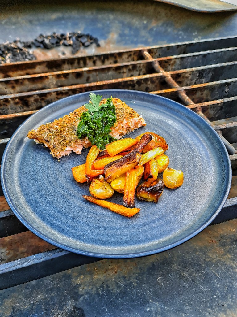Varmrökt lax med ugnsrostad potatis, vitlöksklyftor, fänkål, palsternacka och morot. En chimichurri-aktig röra med bladpersilja, basilika, chiliflakes, chilihonung från Simonsens Farm, olivolja och lite vitvinsvinäger.