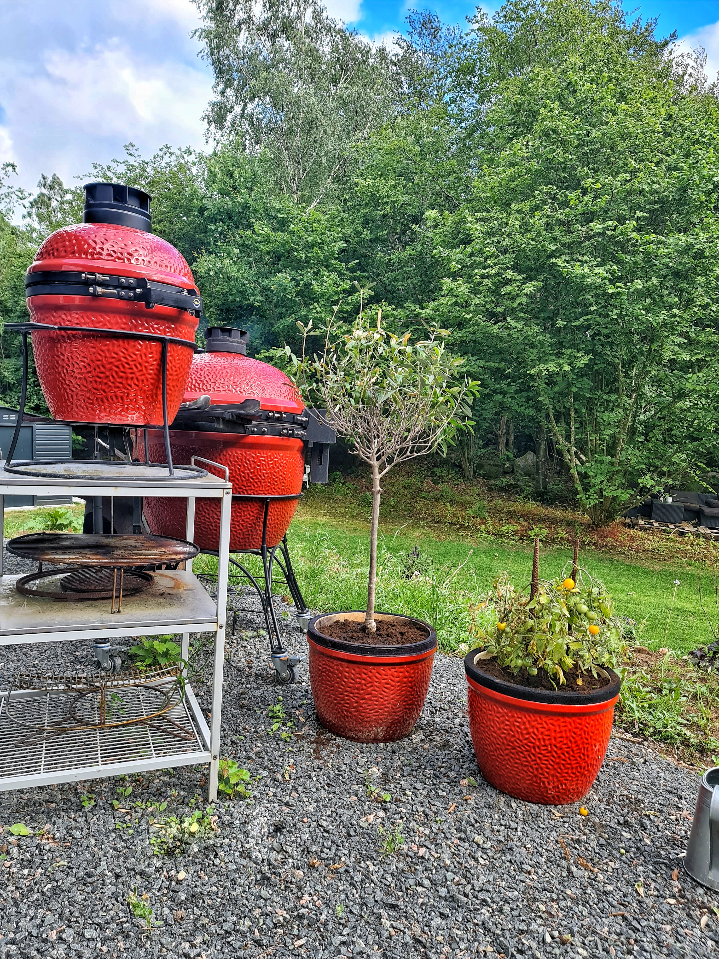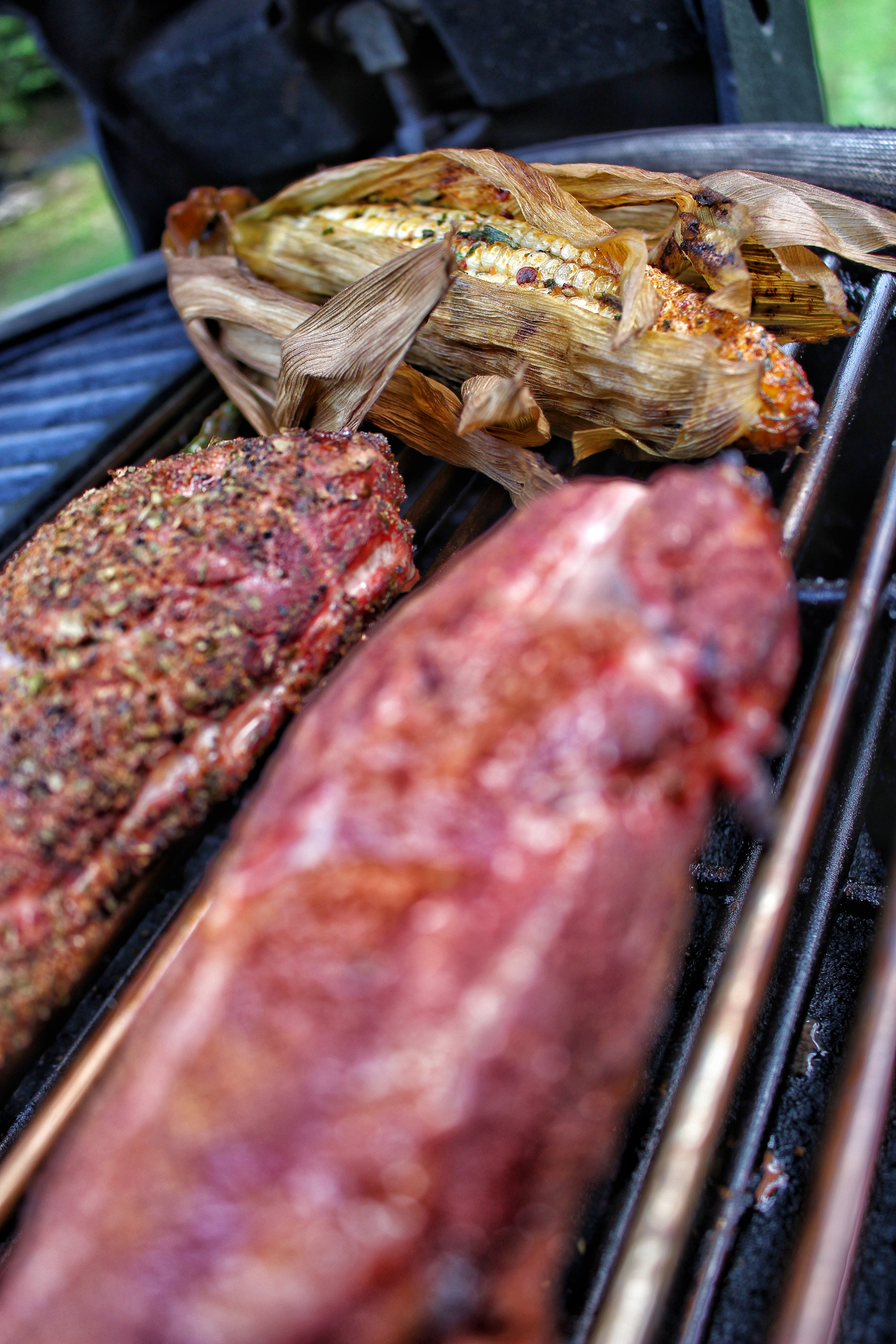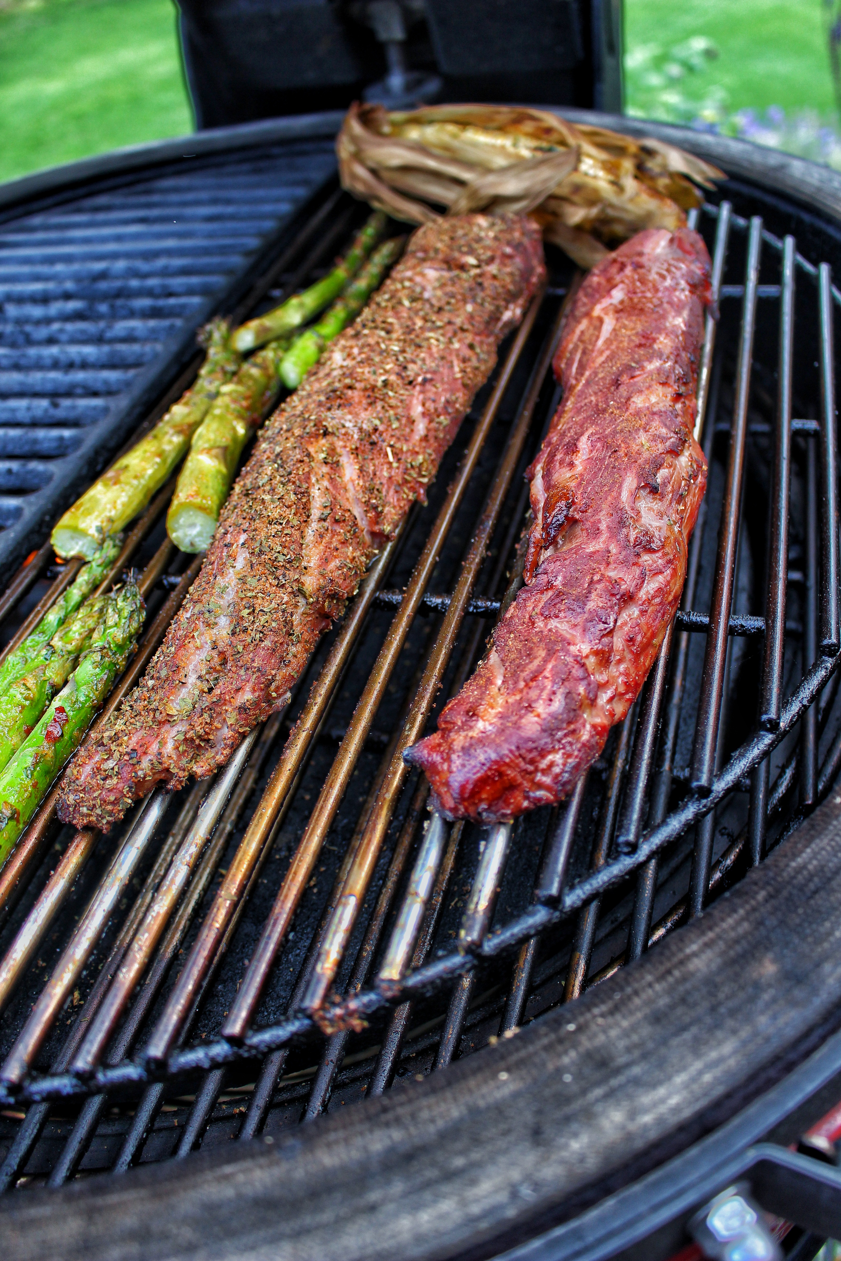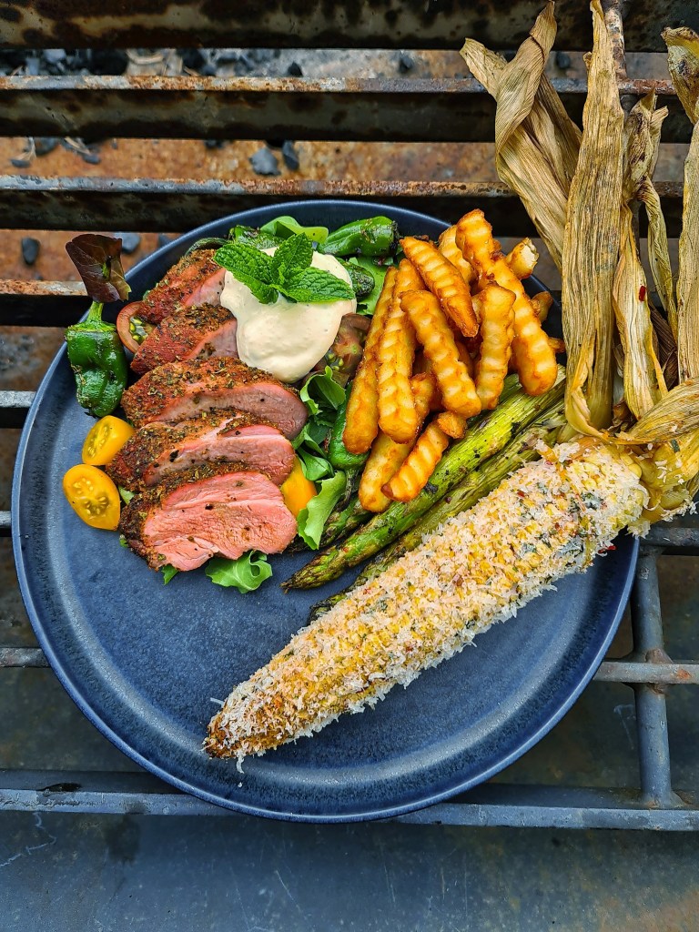 Helgrillad fläskfilé med friterade pommes, sallad, sparris, padrones, tomat och Jusreskogs parmesansås. Färsk, grillad majs som penslats med smör, en chili/woksås, vitlök, salt och örter. Gått indirekt på grillen under tiden köttet tillagades. Sedan rullad i lite mer smör och riven parmesanost.
