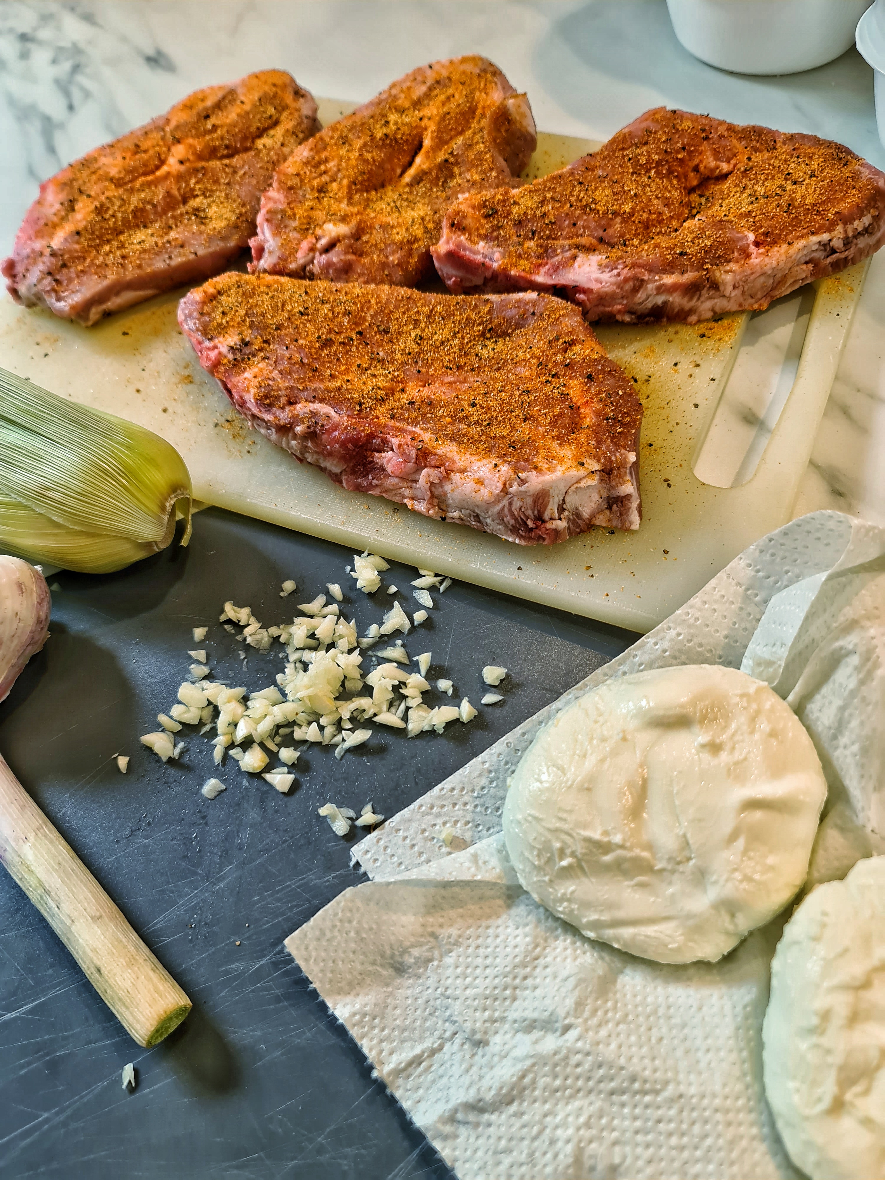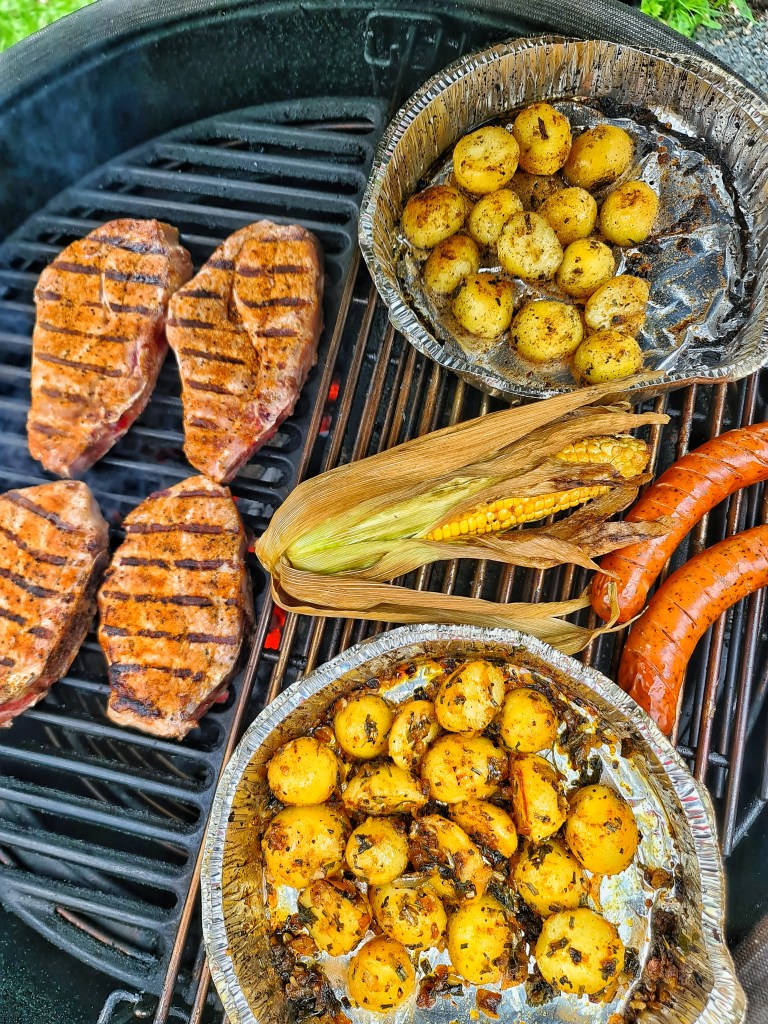 Färskpotatis som förkokts till halvfärdiga för att sedan läggas i en folieform tillsammans med olivolja, lite smör, samma rubb som på köttet, färsk finhackad vitlök, gräslök , bladpersilja, finhackad gul lök och chilihonung. När allt var färdigt på grillen revs en hel mozzarella ner i blandningen och fick gotta till sig innan servering.