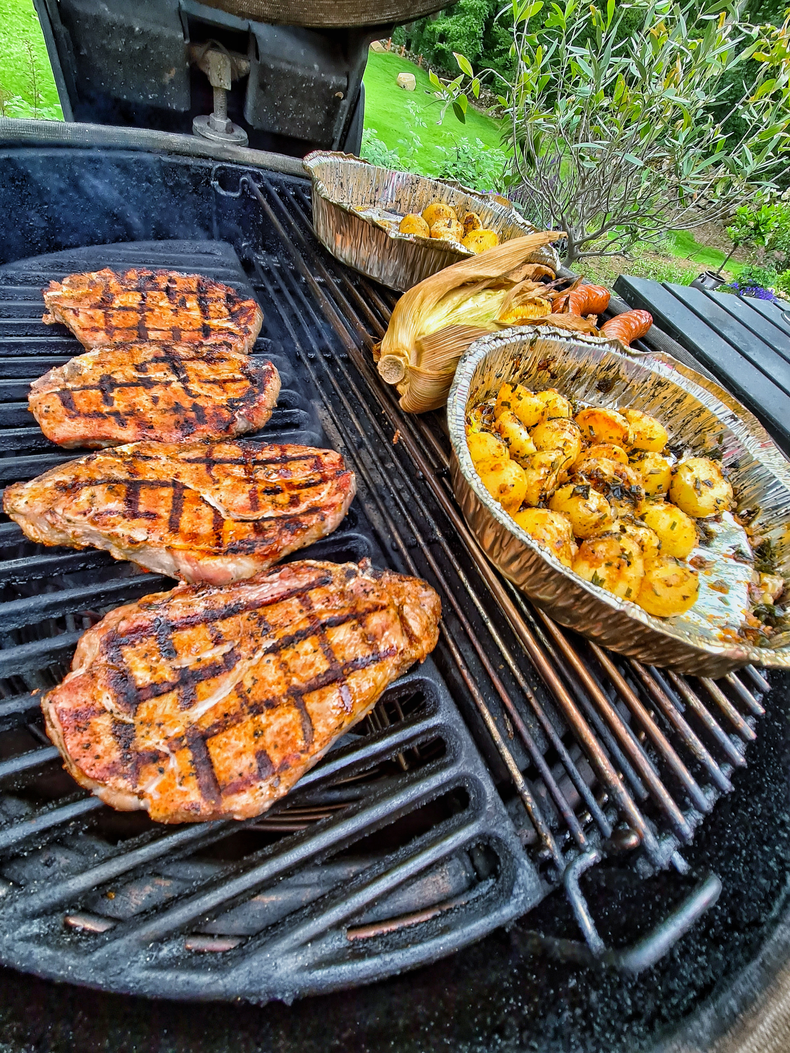 Grillad fläskkarré med färskpotatis. Köttet endast rubbat med Blackwood Burger Rub från Widowmakers för att sedan grillas direkt över het glöd.