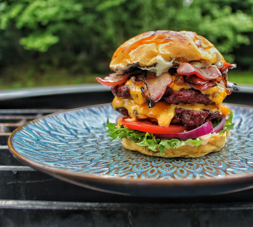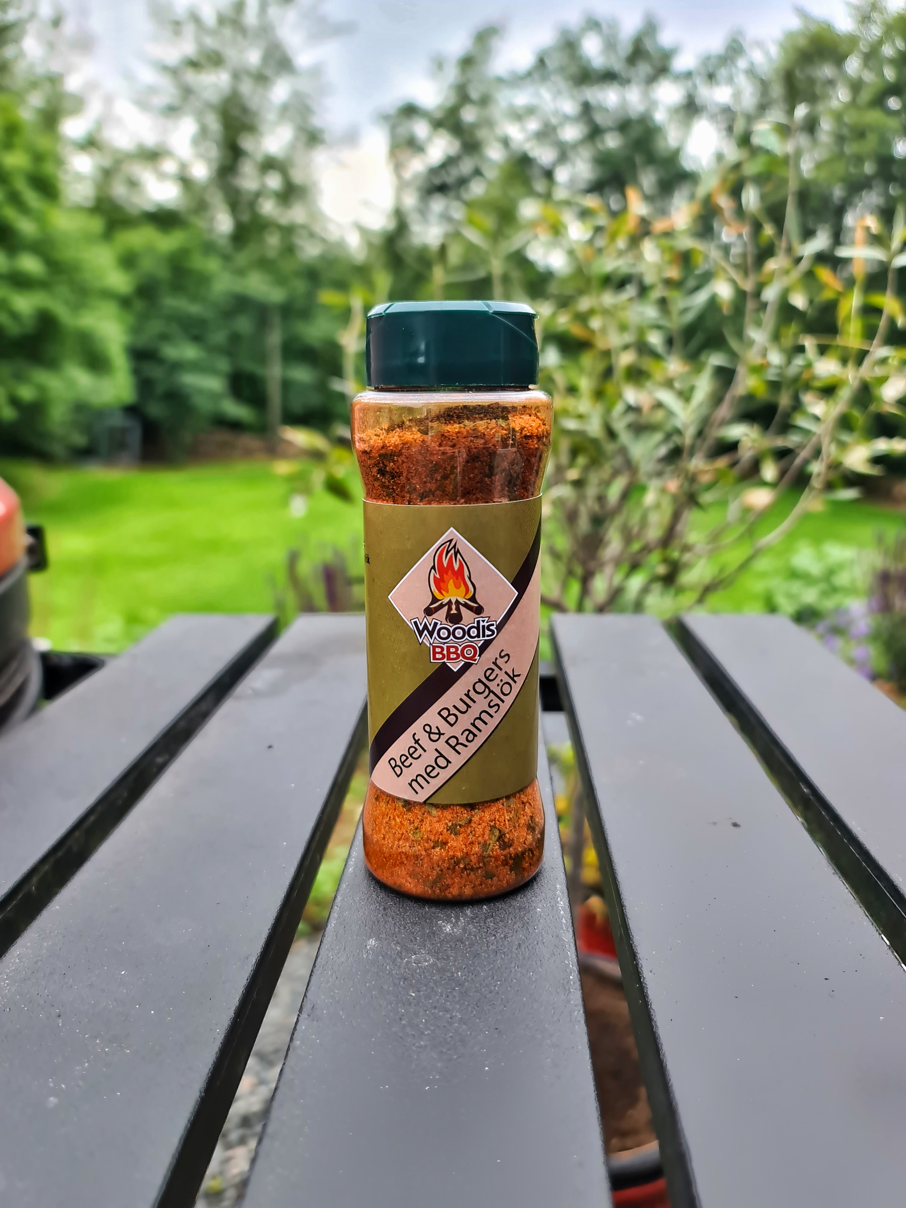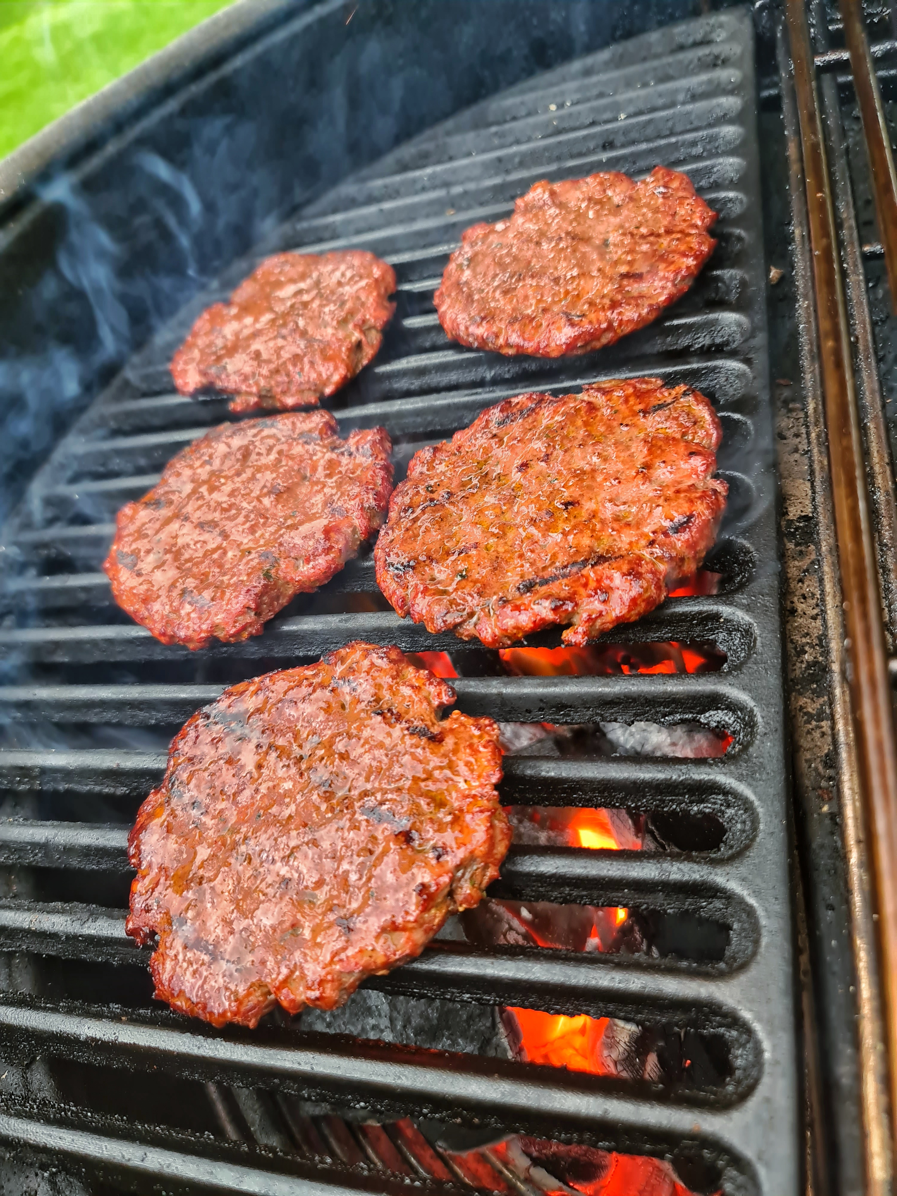 Denna gång ”gallerburgare” och inte smash. Dessutom rätt rejält kryddade med Woodis BBQ Beef & Burgers med ramslök. 100 gram stycket och först lätt rökta indirekt med lite körsbärsflis för att därefter studsa snabbt på gallret.