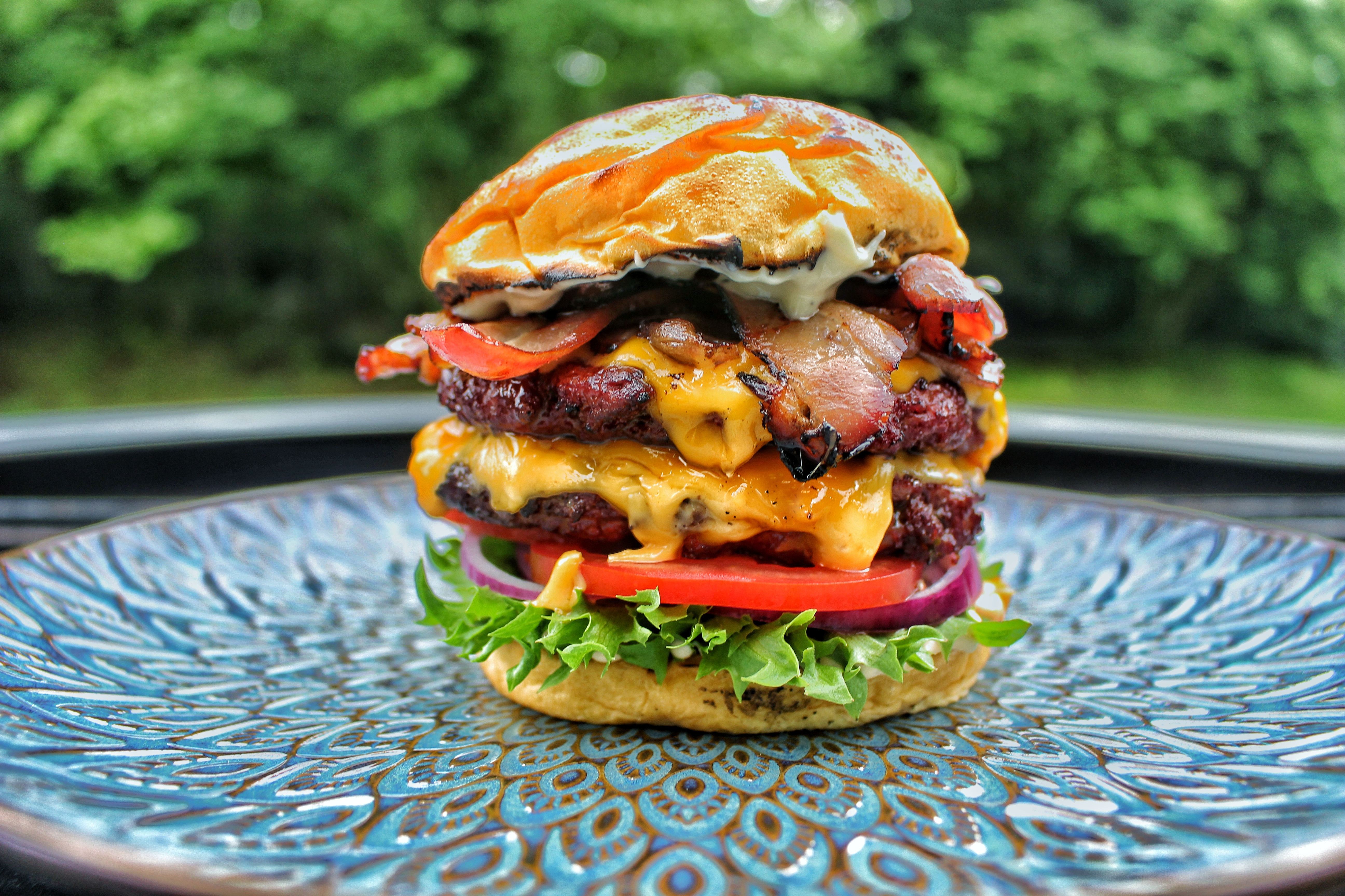 Serverat i briochebröd, hamburgerdressing, crispsallad, rödlök och tomat. 2x patty med cheddarost och sedan en stooor näve av mitt hemmagjorda ”bacon” och en tryffelmajonäs i locket.