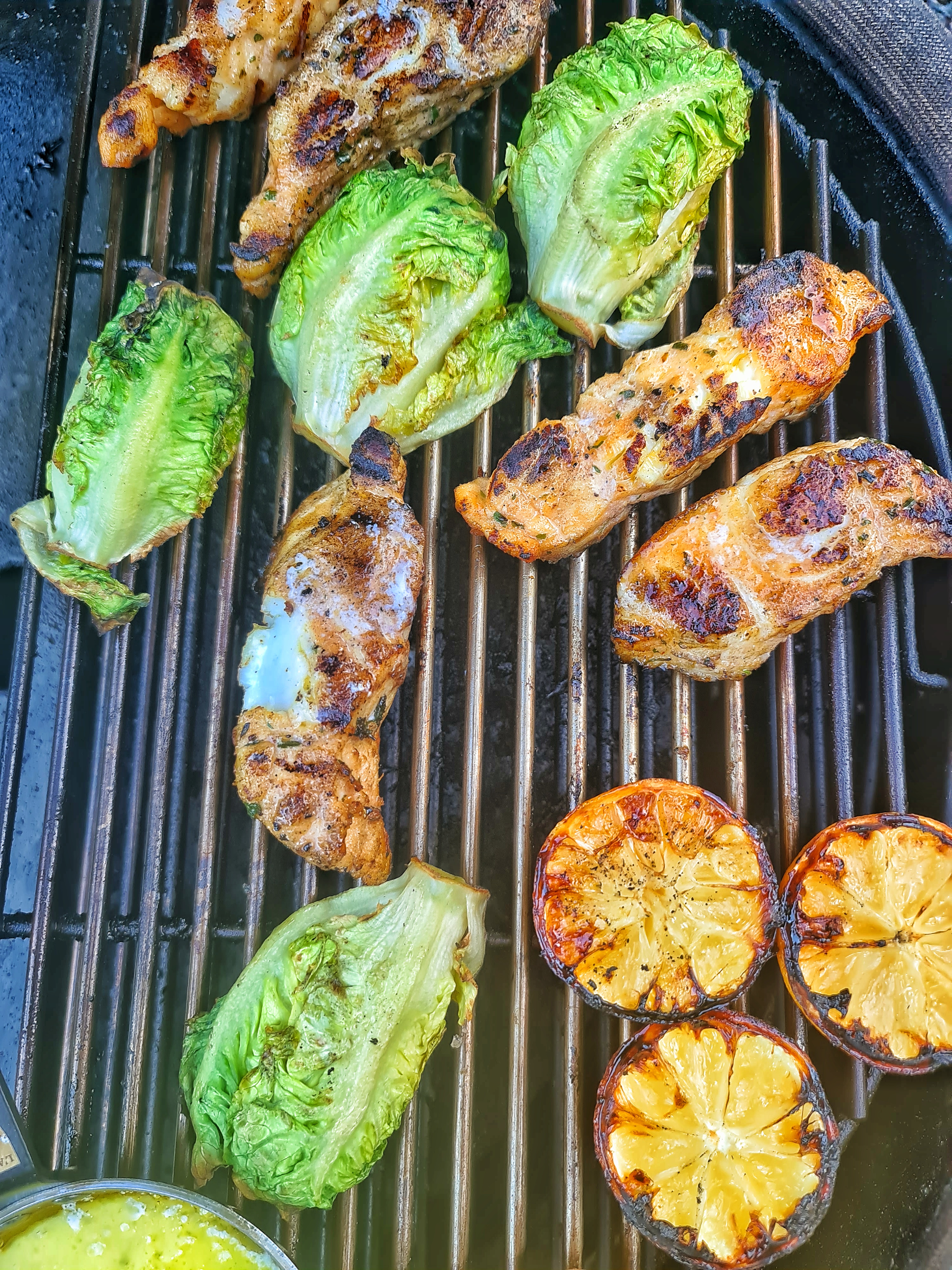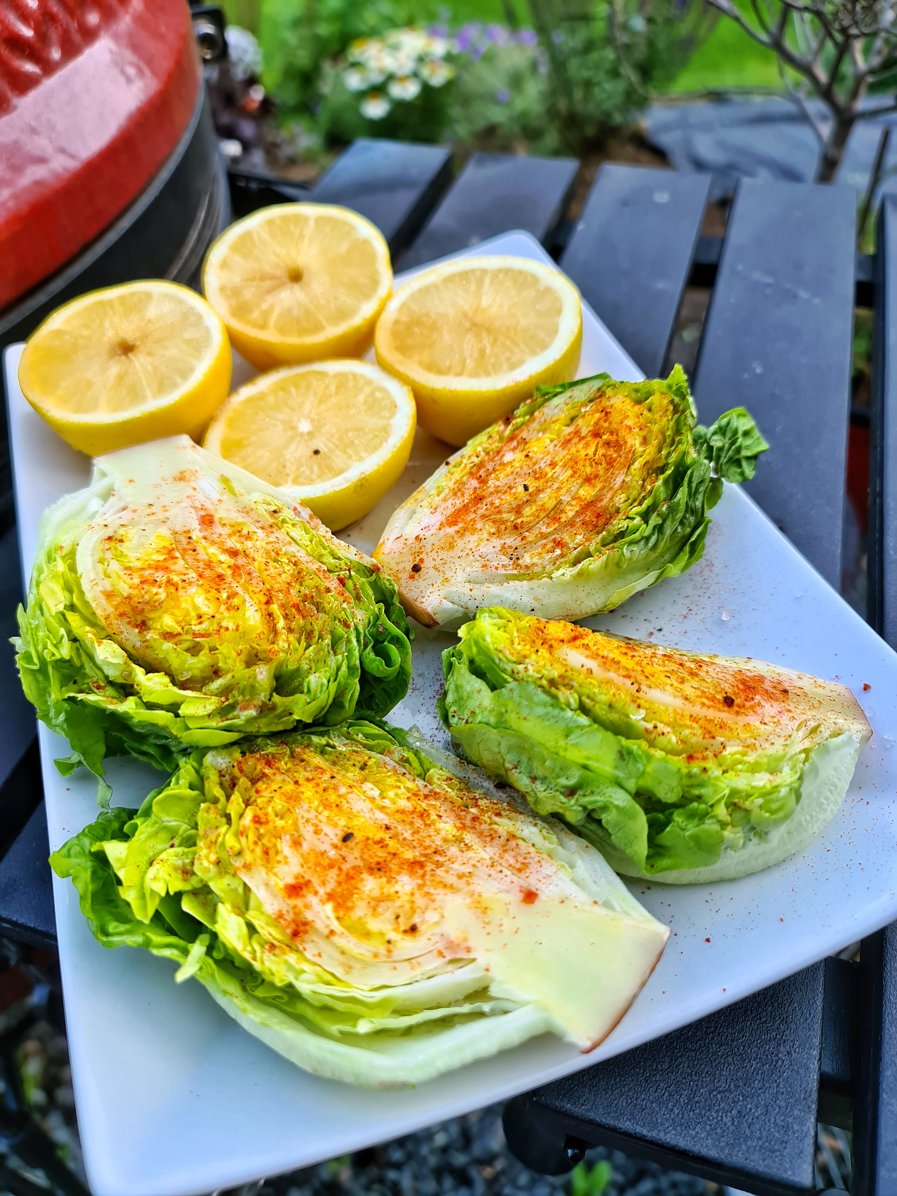 Hjärtsalladen delades på mitten, penslades med olivolja och kryddades med. Blacka Sniper No 3 från Lagrito’s. Grillades direkt över glöd först och sedan en stund indirekt.