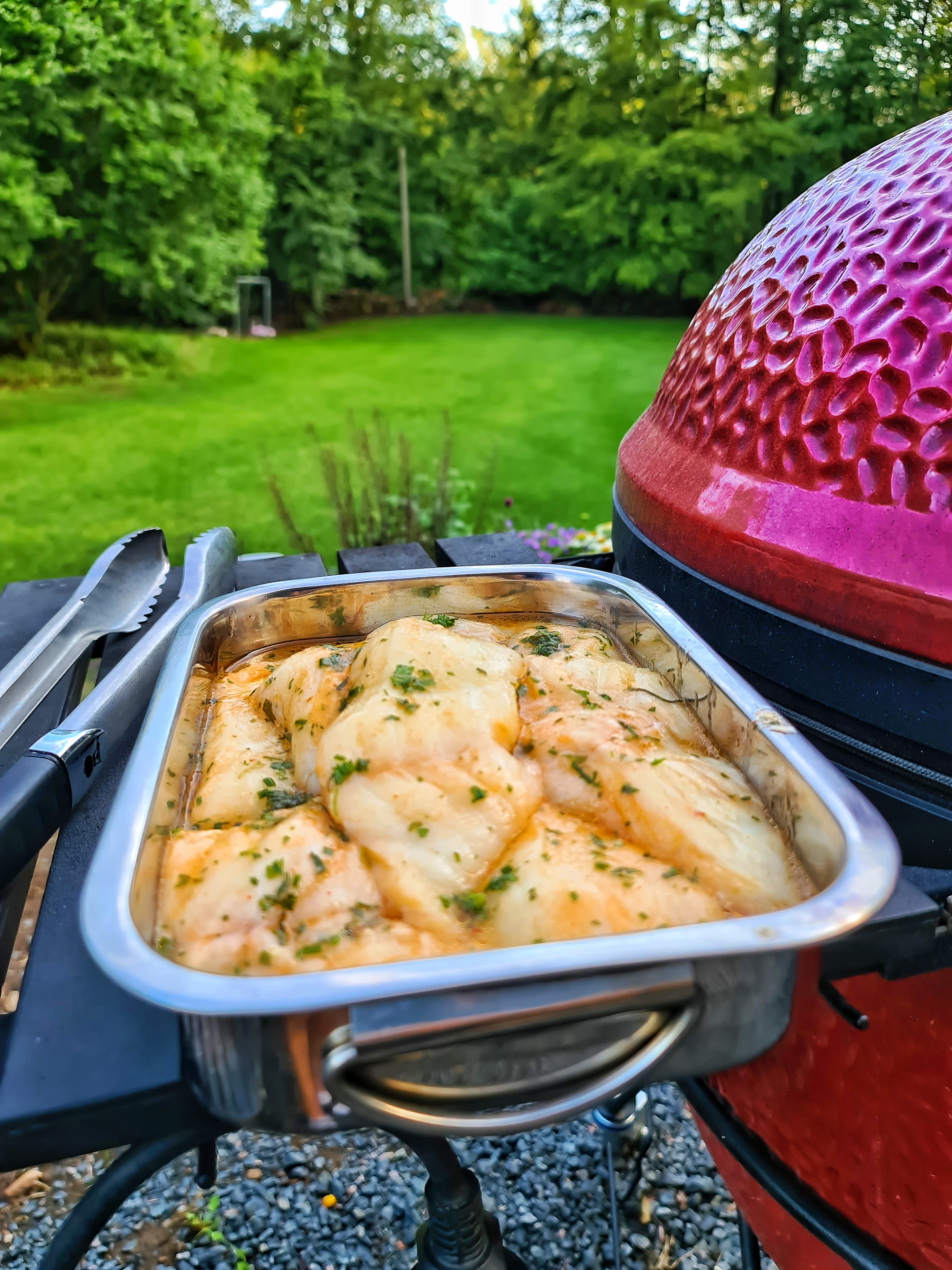 Grillen, min Kamado Joe Big Joe gjordes i ordning med gjutjärnsplatta då jag var osäker på hur fisken skulle hålla ihop och ville inte riskera att den trillade sönder genom gallret. (Galler hade fungerat nu så här i efterhand.)