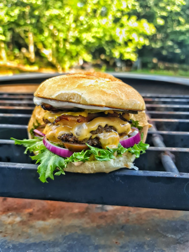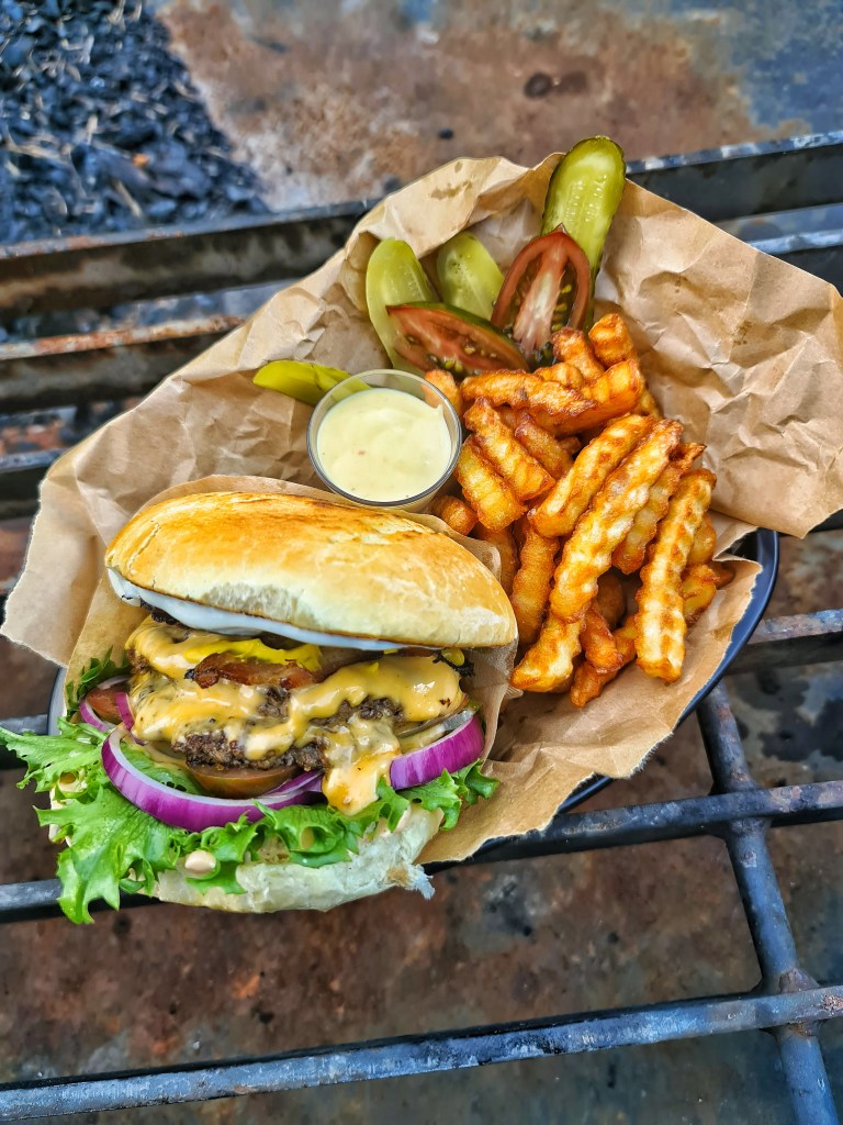 Egenbakade briochebröd, hamburgerdressing, crispsallad, rödlök, tomat, 2×80 grams burgare med cheddarost, egenrökt ”bacon” , yellow mustard och saltgurka. Tryffelmajonnäs. Lite friterade pommes, saltgurka, tomat och jalapeñomajonnäs att dippa i.