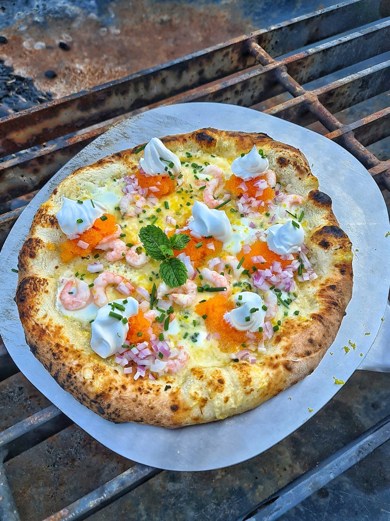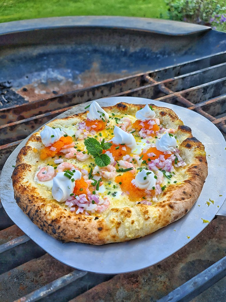 Kalix löjrom, handskalade räkor, vispad creme fraiche, gräslök, rödlök, citronzest och mynta som topping.