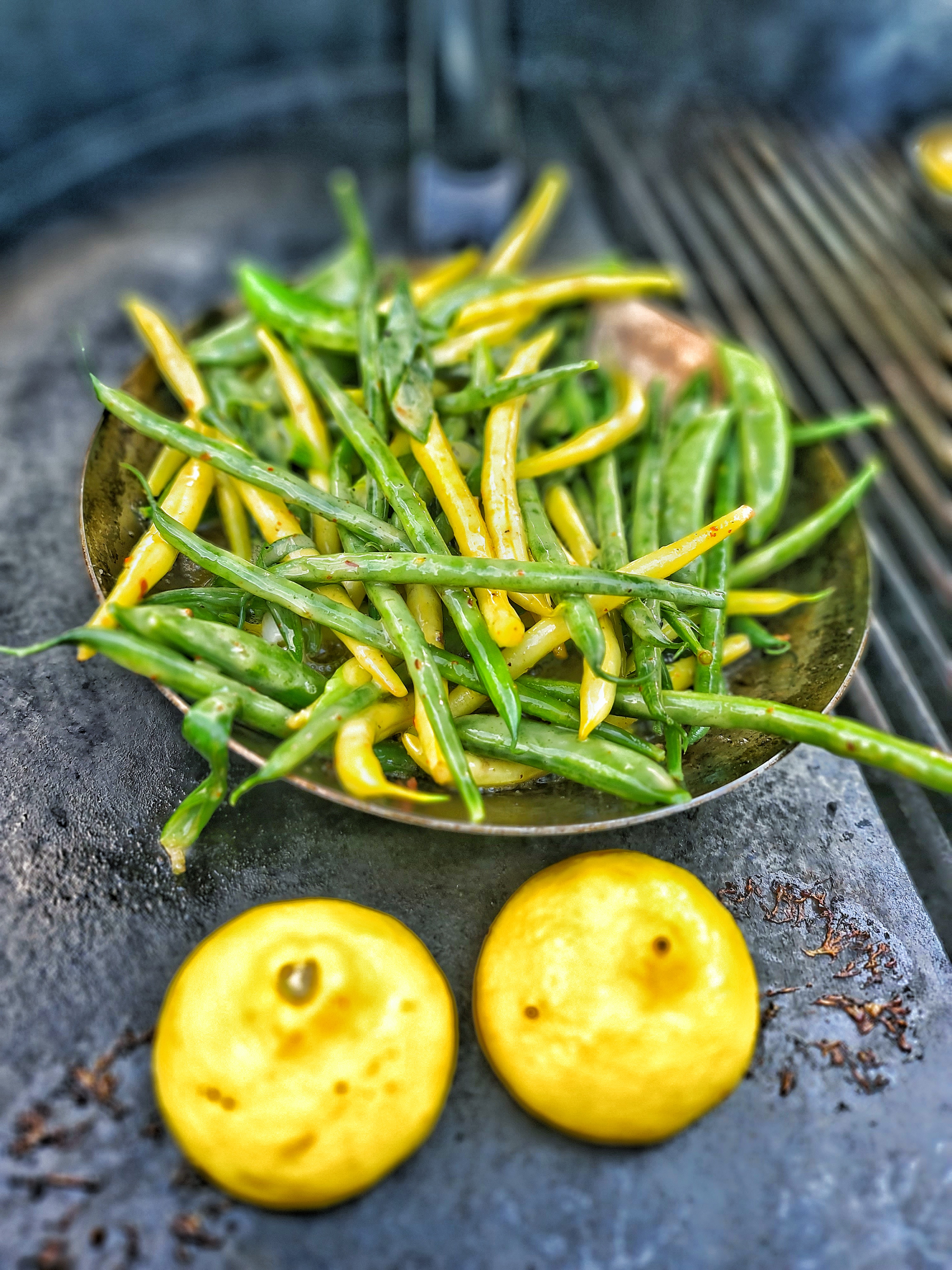 Vaxbönor, haricots verts och sockerärtor med smör, salt, peppar och chiliflakes.
