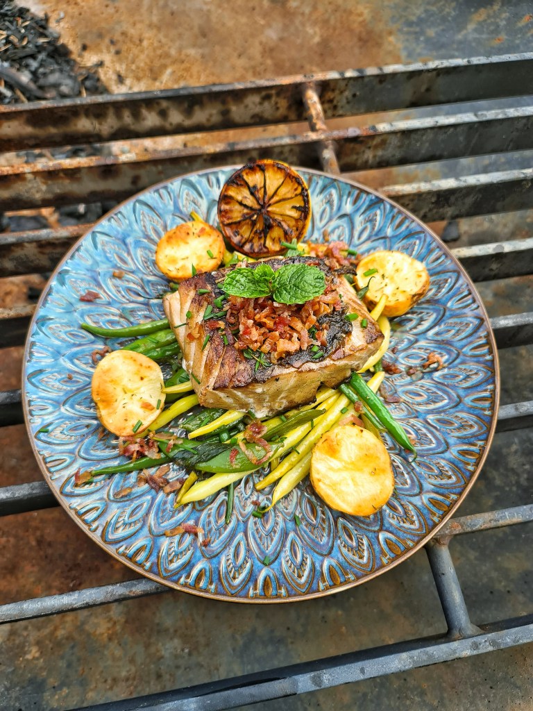 Sejrygg med baconcrisp, primörer (?) och ugnstekt potatis. Och smör. Massa smör.