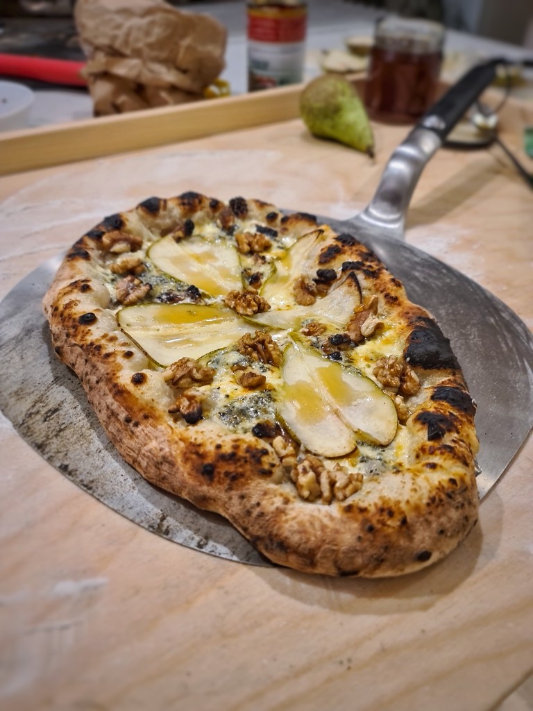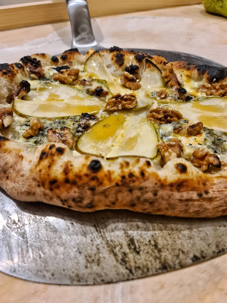 Pizza Bianco med creme fraiche, Port Salut ost, ädelost, päron, valnötter och honung.