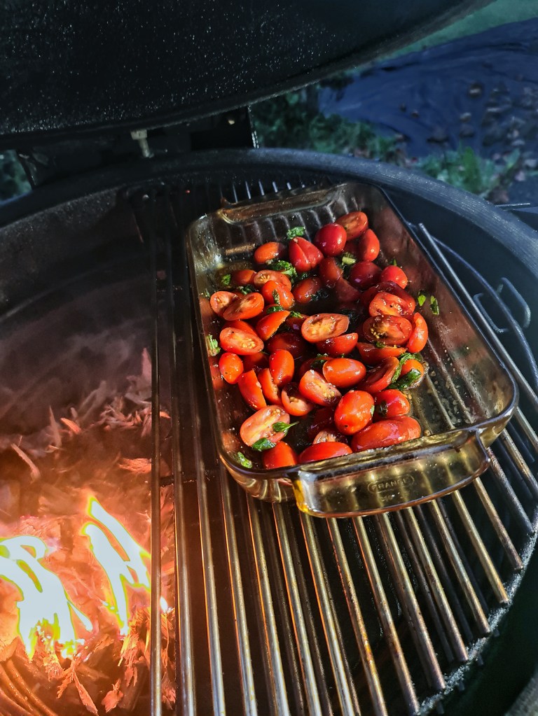 Börja med de rökta körsbärstomaterna då de tar en stund att tillaga. Starta grillen för indirekt grillning. Måltemp ca 80-100 grader. Total tidsåtgång: Ca 2 h.