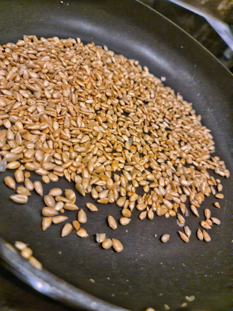 Rosta solroskärnorna hastigt i en torr, het stekpanna. Håll koll – Det kan gå fort!