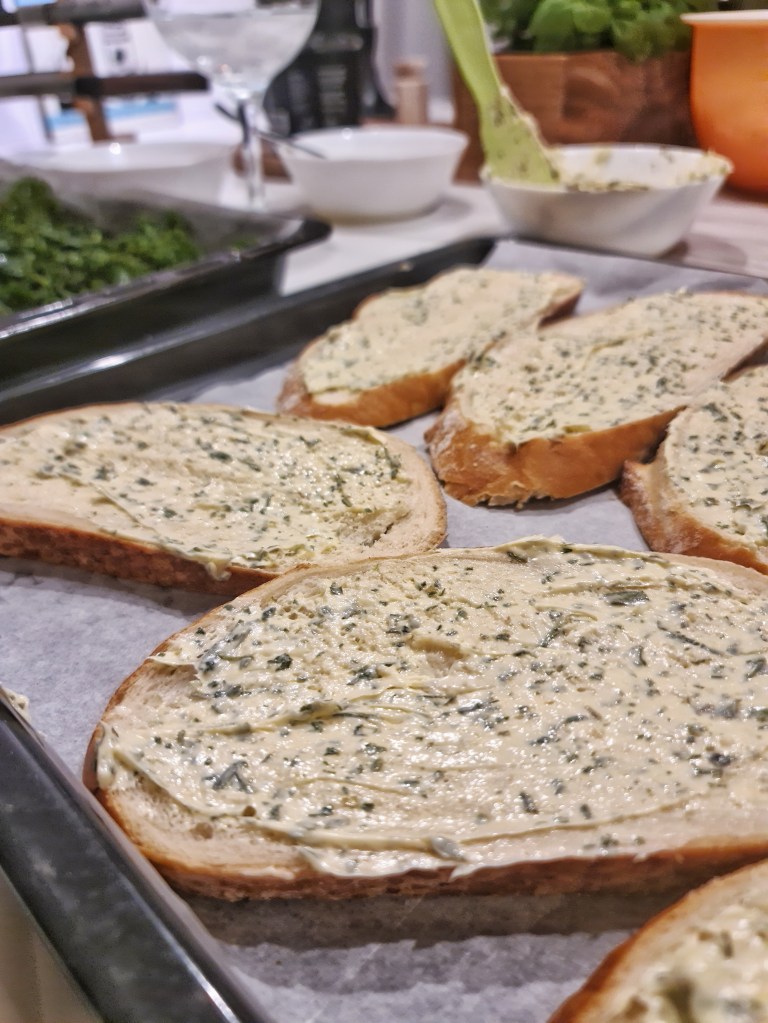 Här höftar man hej vilt med ingredienserna efter tycke och smak. Men tag ett par rejäla klickar smör, finhacka örter, pressa vitlök (en eller ett par klyftor), salta och peppra efter behov. Häll i lite olivolja och rör om. Bred ut på mackan.