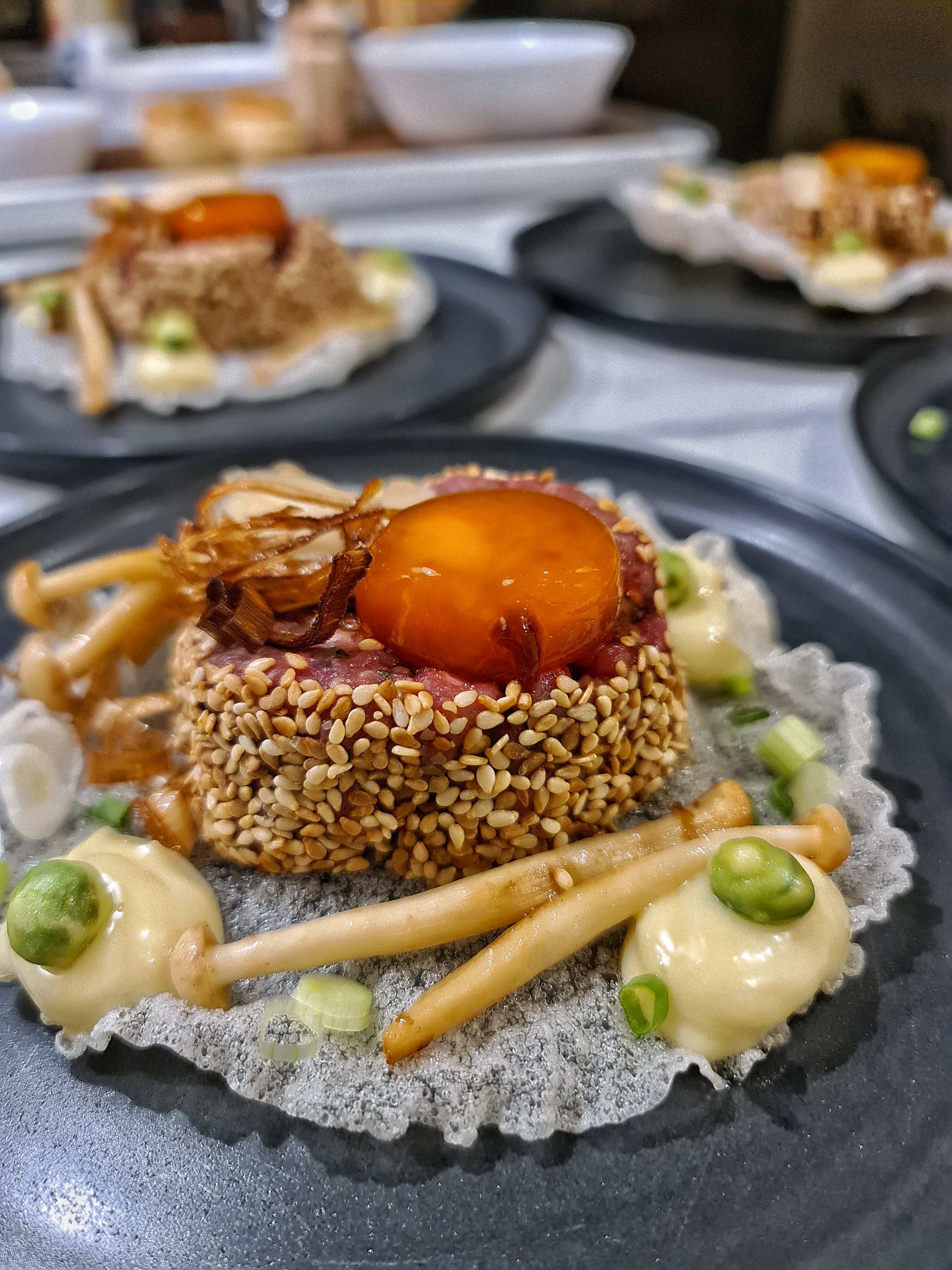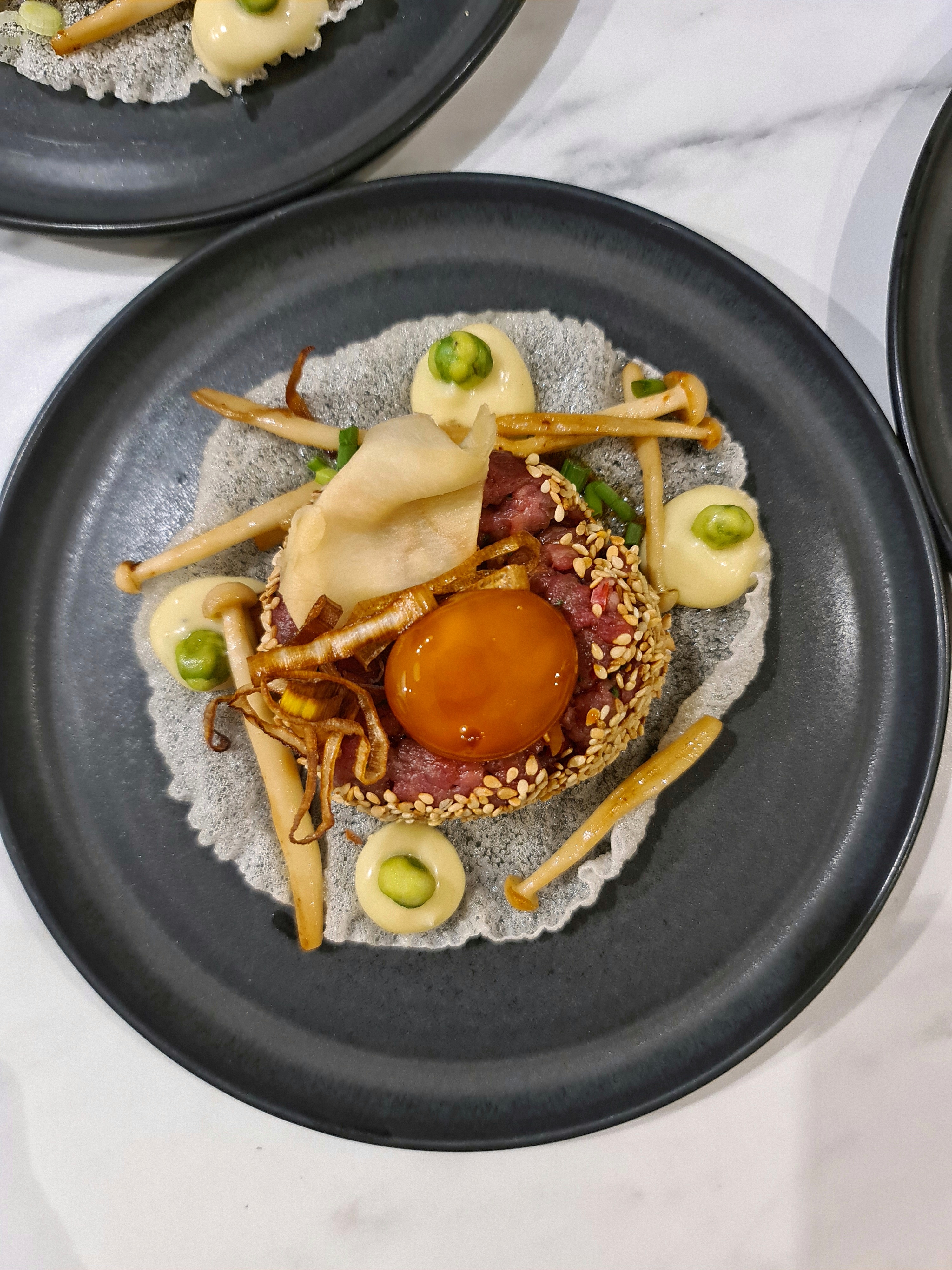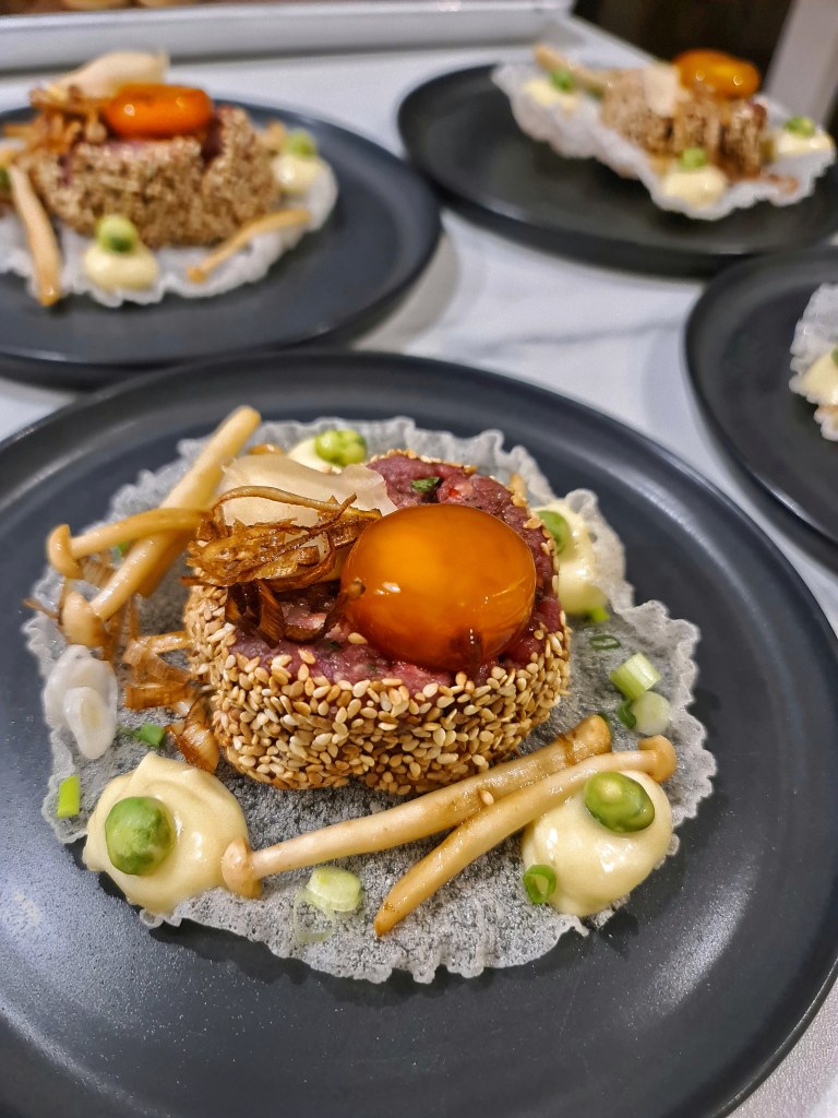 Rispapper friterades och bildade basen. Råbiffen på tillsammans med inlagd ingefära, friterad purjolök samt en sojagravad äggula.