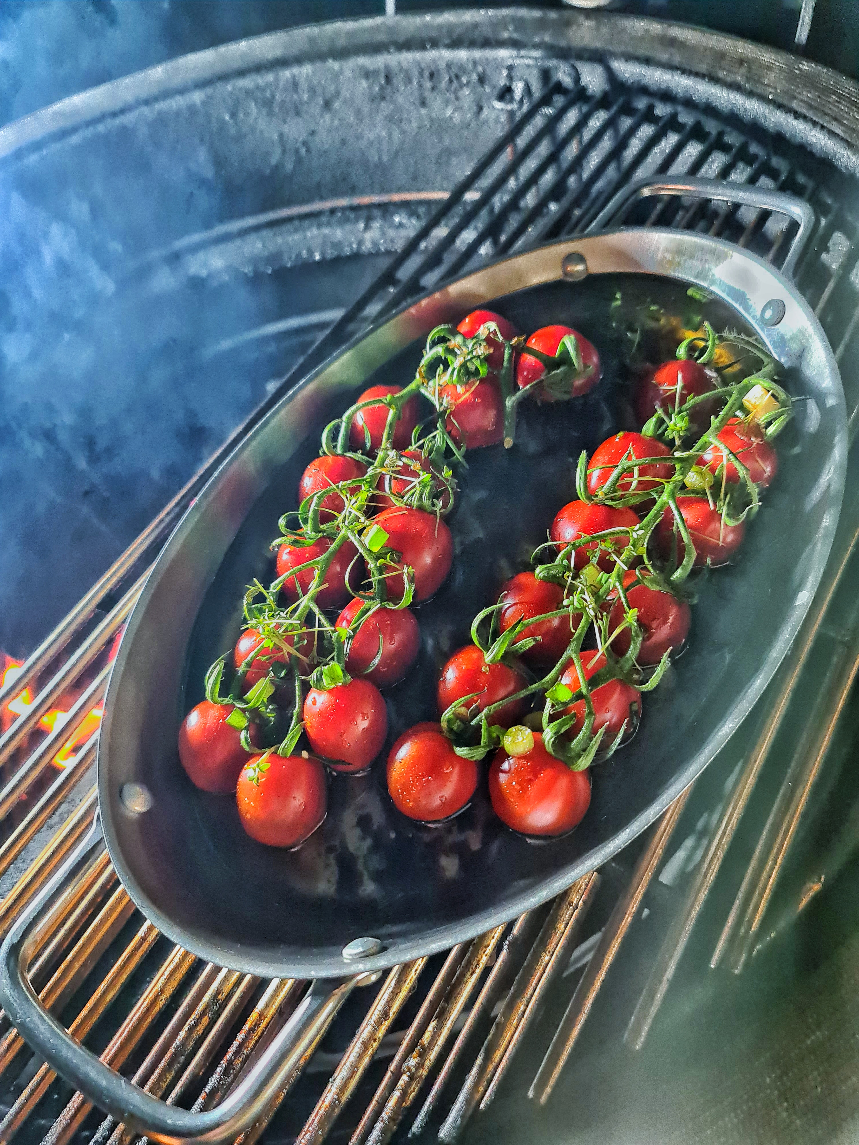 Pigwingstomater vilket som kanske bekant innebär kvisttomater som ligger i ett oljebad med balsamvinäger, vitlök, salt och peppar. Indirekt på grill eller i ugn tills konsistensen är mjuk och fin.