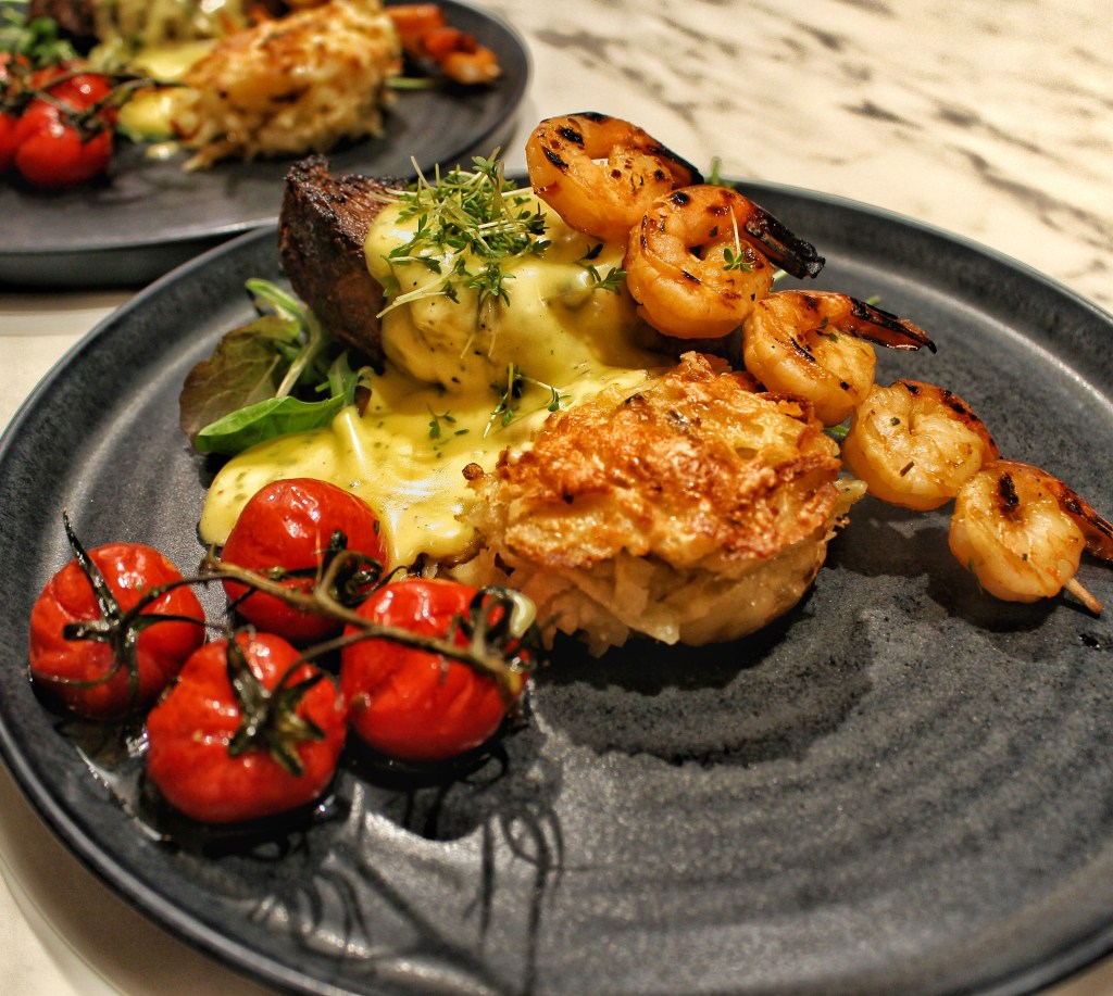 Helgrillad oxfilé med touch av asien serverat med potatisbakelse, vannameiräkor och hemslagen bearnaisesås.