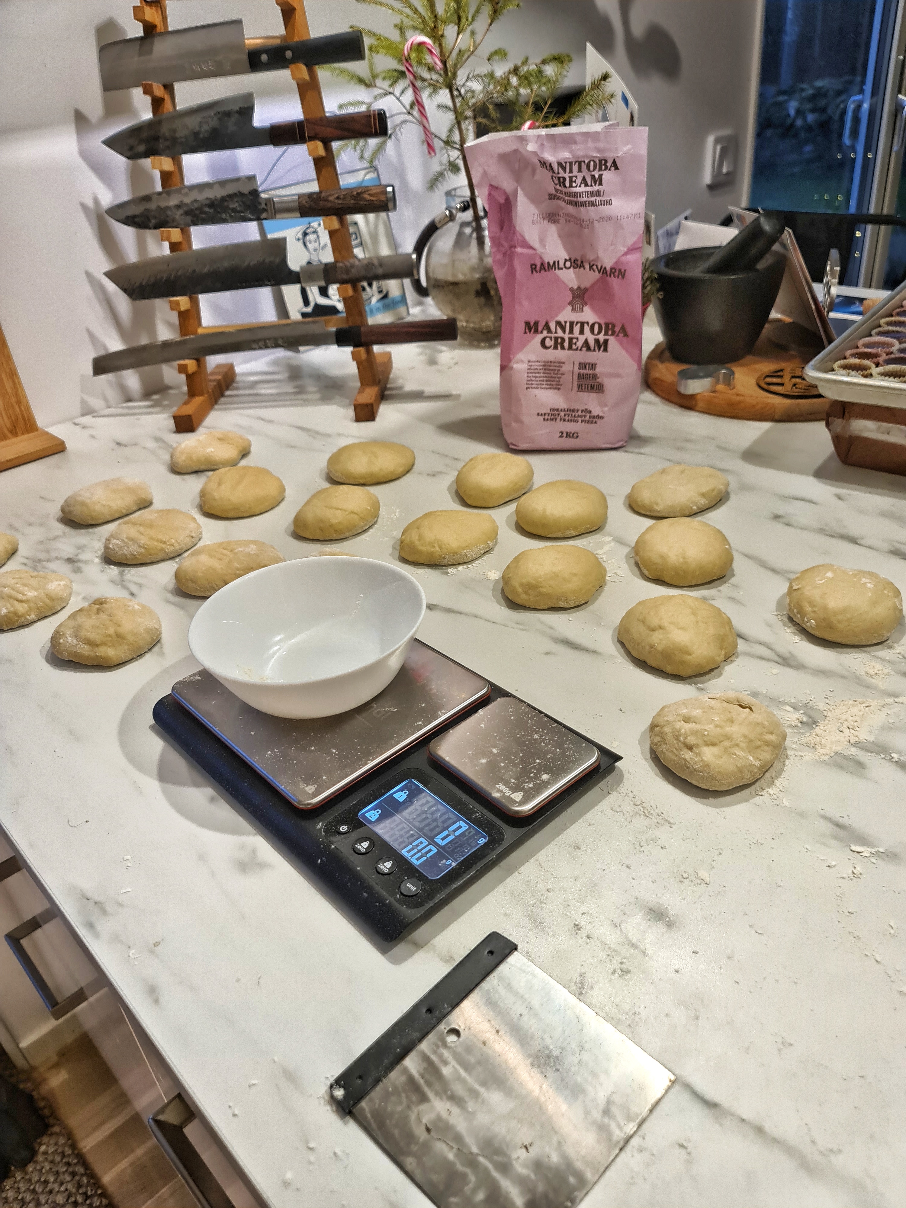 - Plocka ut degen och dela i lika stora bitar. Ca 10 bröd får du ut av detta recept. Bearbeta degen till runda bollar. Platta till lite lätt och låt jäsa i ytterligare minst en timme under handduk.