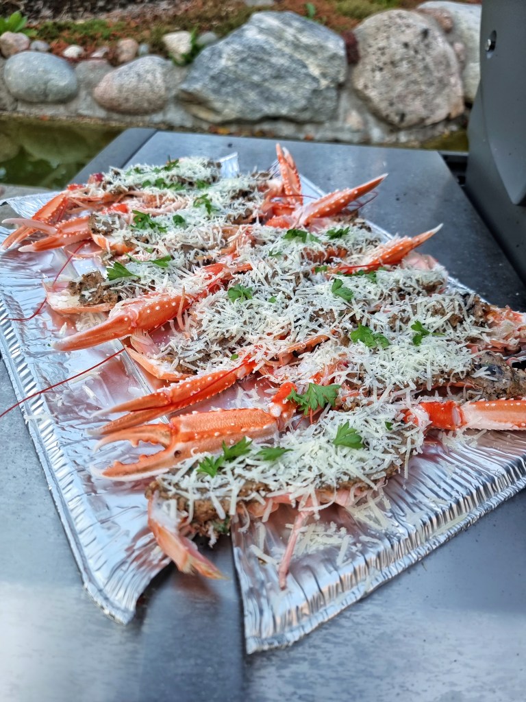 Blev lite skaldjur igår. Jag gratinerade havskräftor med bland annat black garlic och parmesanost och rökte lite räkor. Otroligt gott även fast färgen är lite speciell på havskräftorna.