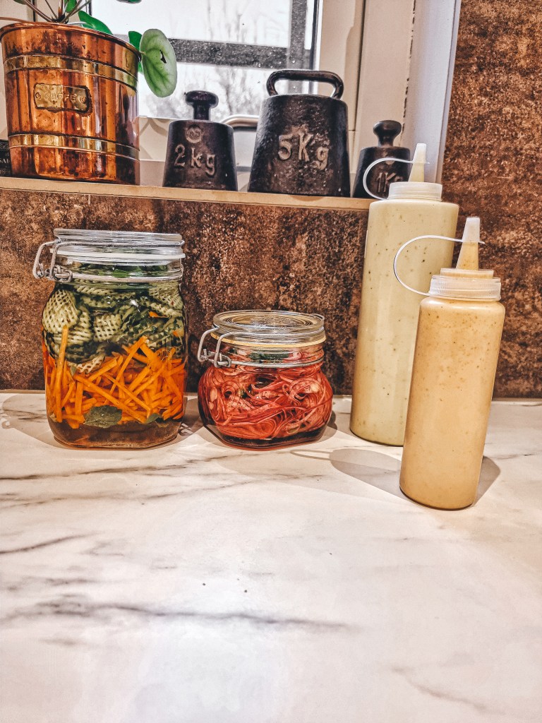 Majonnäserna gjorde jag helt enkelt genom att slå en majonnäs där jag i den ena öste i en tub wasabipaste och i den andra en bra skvätt srirachasås. Lite pressad citron. Smaka av med lite salt och peppar. Sedan spär jag majonnäsen med lite vatten för att de ska bli lite mer lättflytande.