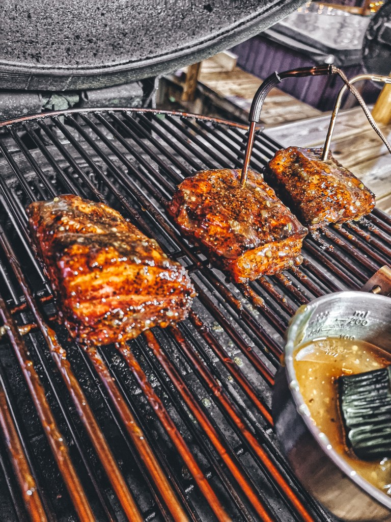 Fläsksidan rubbades med salt, peppar och Texas Swine Shaker från B&B Better Burning Charcoal. Fick gå indirekt på kamadon på ca 110-115 grader tillsammans med rökpellets från Broil King. Innertemp av ca 92+ men gick fortfarande att skiva.