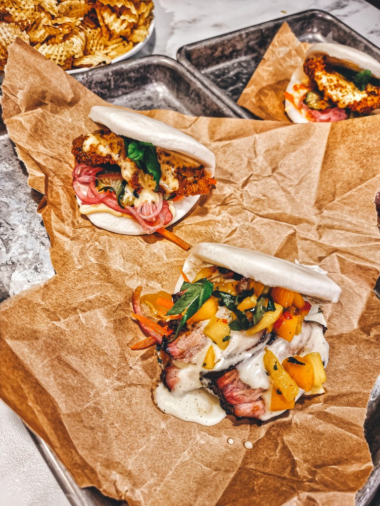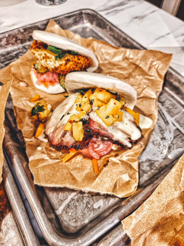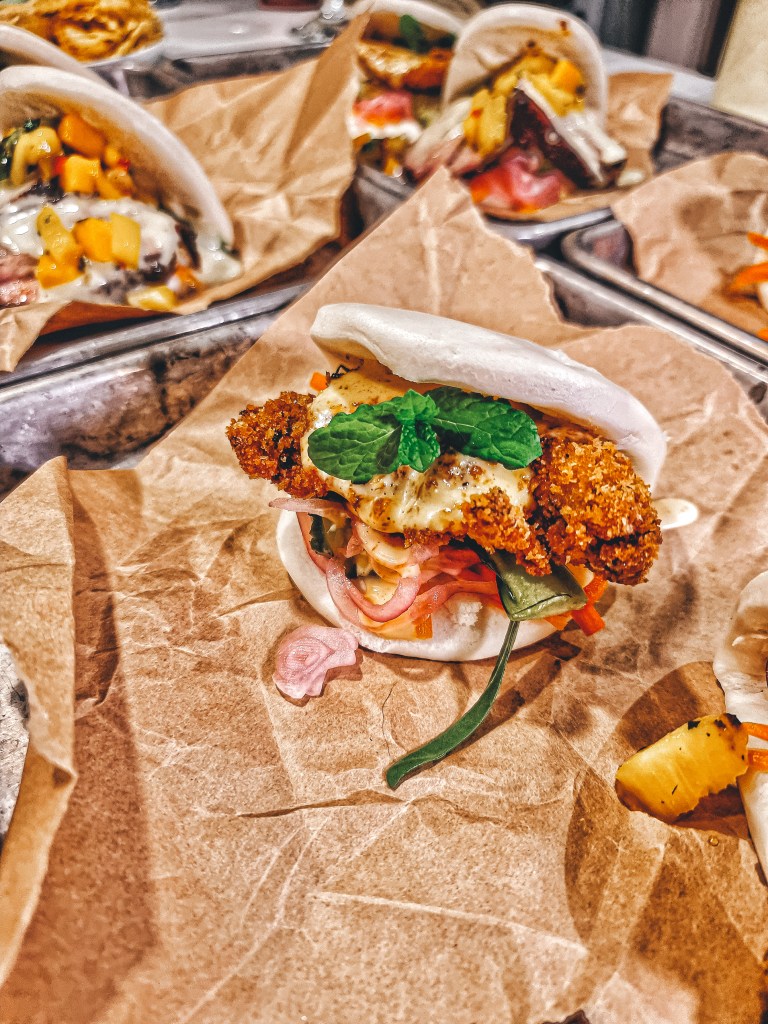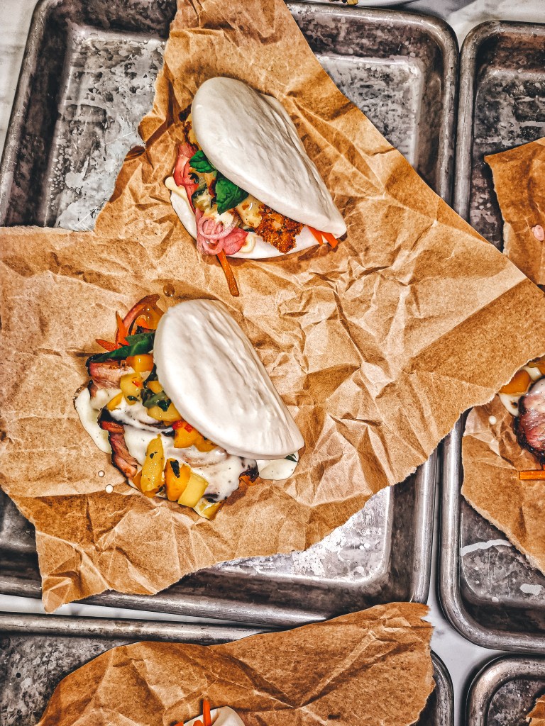Bao Bun – Steamed buns. En version med fläsksida som fick nästan 8h i grillen och en version med pankofriterad kycklinglårfilé. Lite blandade tillbehör med en mango och ananassalsa, srirachamajo, wasabimajo, picklade morötter, gurka och rödlök, pak choi och kewpiemajonnäs. Mynta, persilja och koriander efter önskemål.